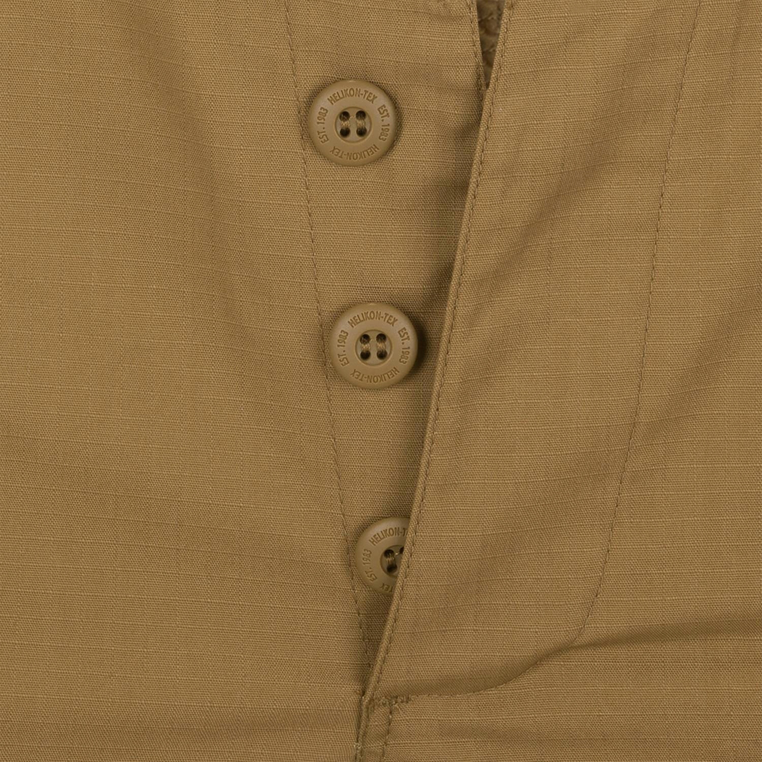 Profilowane wzmocnienia na kolanach mogą również posłużyć do przenoszenia wewnętrznych wkładek ochronnych. Spodnie zapinane są na guziki z logo Helikon-Tex®, natomiast w talii regulowane są za pomocą taśm z rzepami.