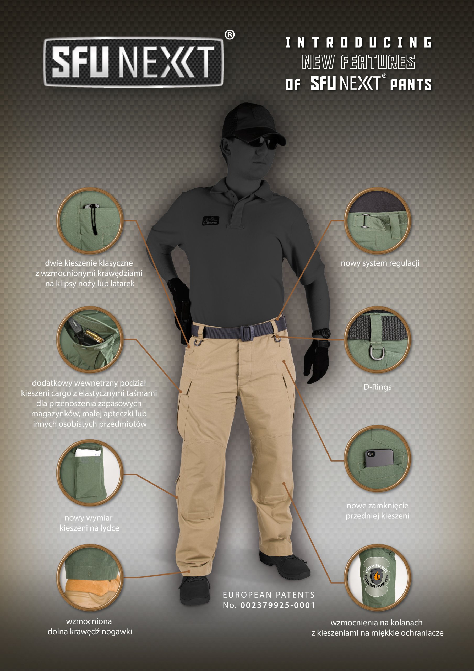 Spodnie taktyczne Helikon SFU Next SP-SFN-PR-01 - spodnie z ulepszonej serii SFU (Special Forces Uniform) łączą w sobie wygodny, anatomiczny krój oraz klasyczny wygląd. Zawierają 9 kieszeni umożliwiających wygodne przenoszenie ekwipunku. Dodatkowo spodnie SFU NEXT posiadają wzmocnienia na pośladkach oraz na wysokości kolan. Znajdują się tu także kieszenie na miękkie ochraniacze.