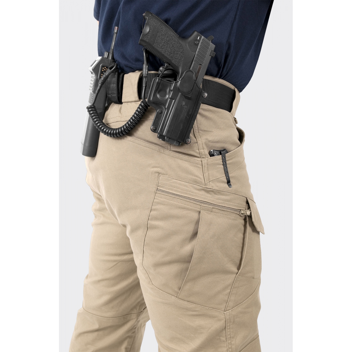 - Dwie wąskie kieszenie wkomponowane w kieszenie tylne, na magazynki lub pałkę teleskopową.
