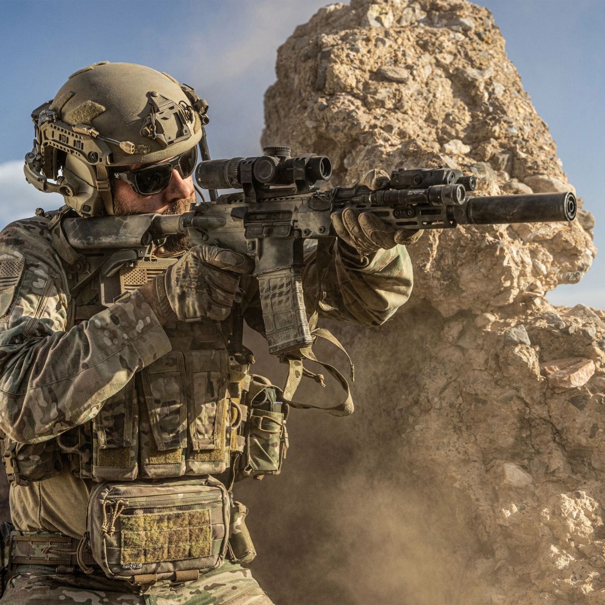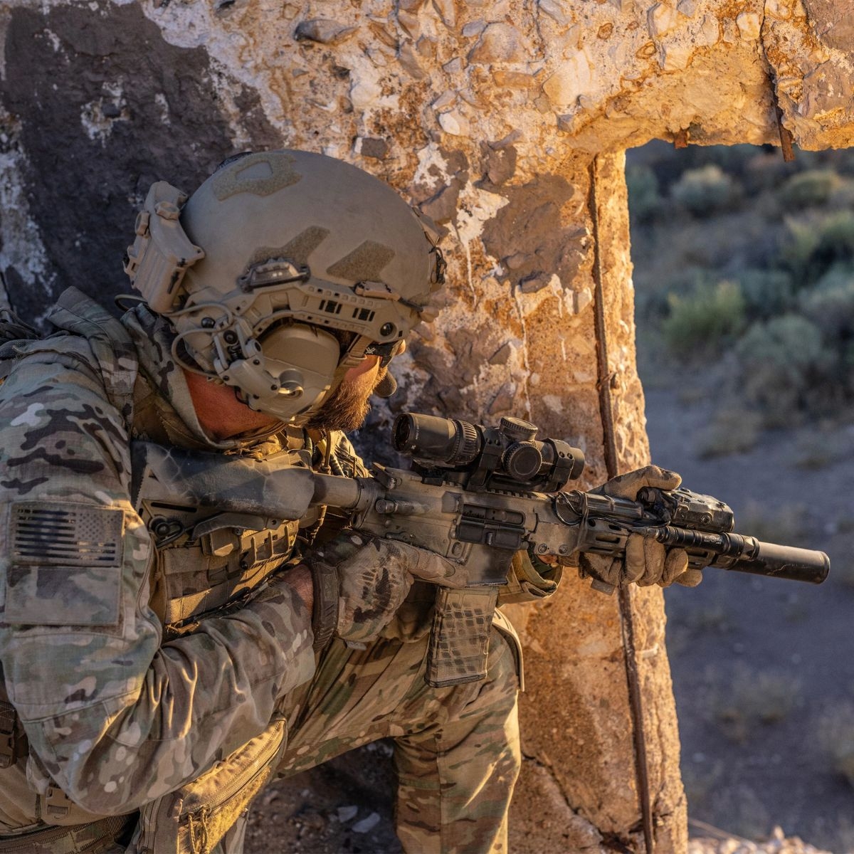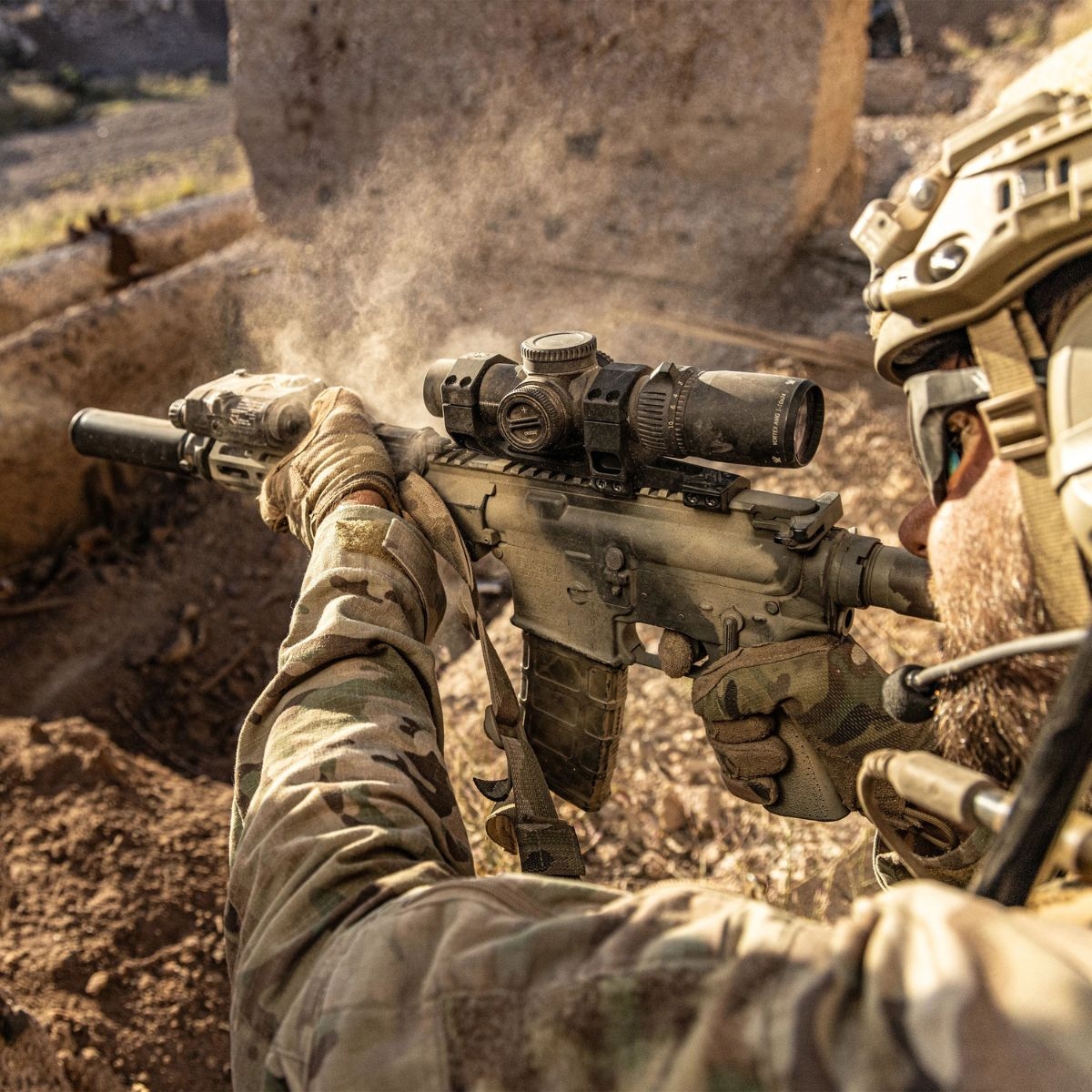 - Przy powiększeniu 1x: Siatka prezentuje się jako jasny, czytelny okrąg z kropką typu „Bright Dot”, co pozwala na instynktowne celowanie obuoczne w bliskim kontakcie (CQB), identycznie jak w przypadku celownika kolimatorowego.