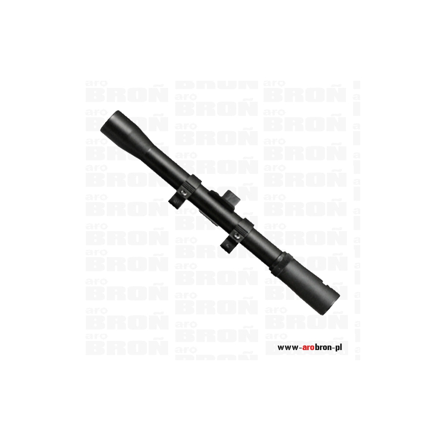 Celownicza luneta stałoogniskowa firmy Kandar. Średnica obiektywu 20 mm. Powiększenie x4. Luneta przystosowana jest specjalnie do wiatrówek. W komplecie znajduje się dwuczęściowy montaż.