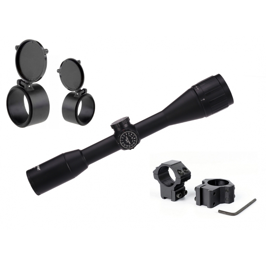 W komplecie: luneta + zakrywki flip-open na okular i obiektyw + montaż 2częściowy średni na szynę 11mm + szmatka do czyszczenia.
