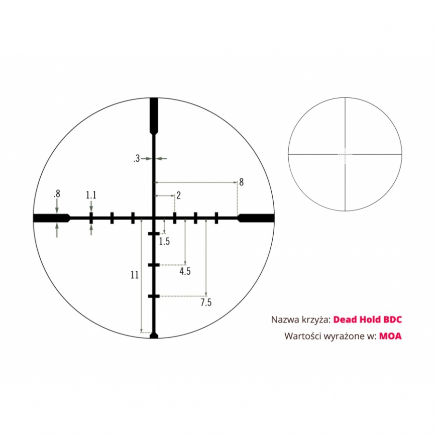 Zastosowana w celowniku siatka Dead-Hold BDC ułatwia korektę strzału oraz eliminuje konieczność wprowadzania kolejnych poprawek. Przeznaczona jest ona do myślistwa i strzelectwa, na różnych dystansach, gdzie kluczową rolę odgrywa konieczność długiego celowania. Dodatkowo, system regulacji paralaksy (AO) zapewnia maksymalną precyzję, nawet w przypadku małych celów.