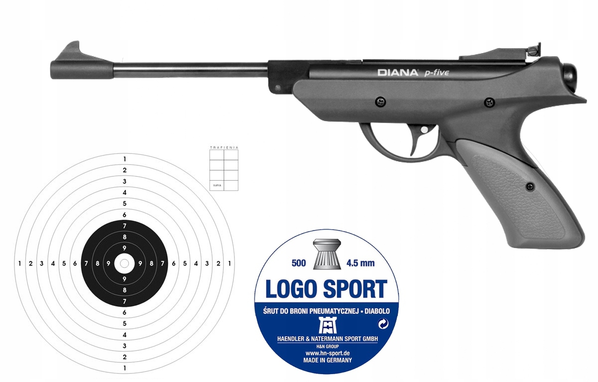 Zestaw: wiatrówka Diana P-Five 4,5mm, opakowanie śrutu Logo Sport 4,5mm 500szt, komplet 50szt solidnych tarcz 14x14 cm