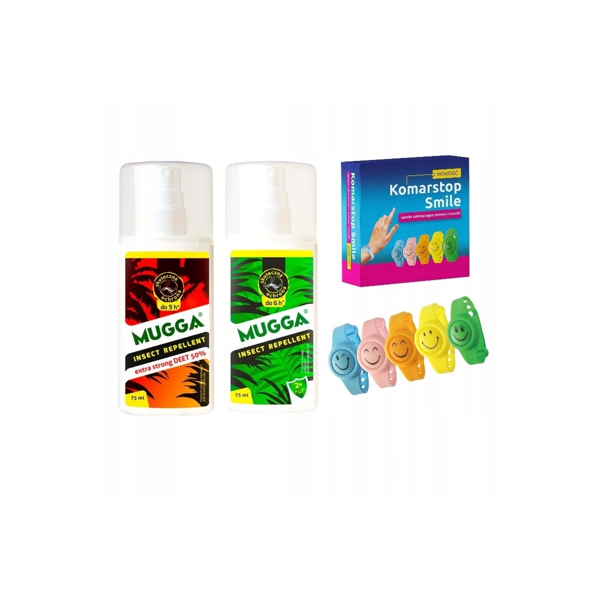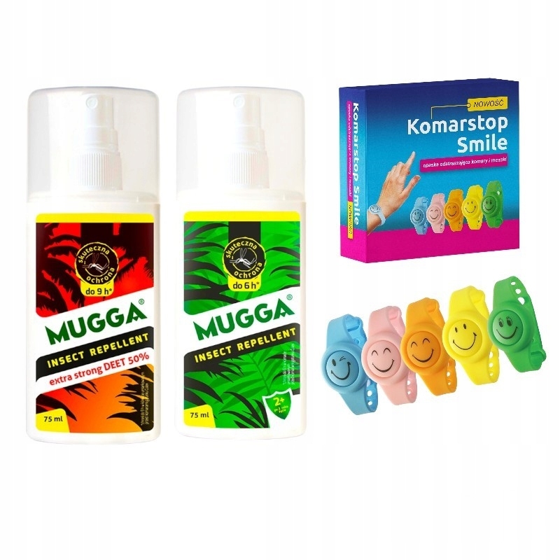 ZESTAW RODZINNY NA KOMARY I KLESZCZE MUGGA 9,5% 50% opaska Komarstop Smile