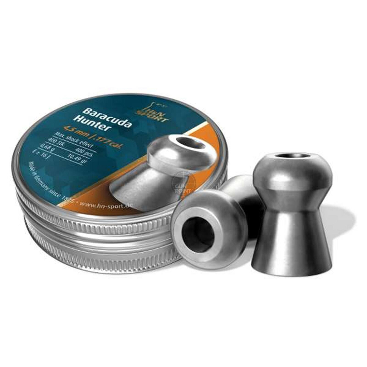 Śrut H&N BARACUDA HUNTER 4,5mm 400szt - wysokiej jakości, średnio ciężki śrut niemieckiego producenta H&N Sport. Śrut bardzo precyzyjny, przeznaczony na dalekie dystanse - powyżej 50 metrów. Nawet na takim dystansie nadal zachowuje skupienie i dużą siłę obalającą połączona z kontrolowaną penetracją i deformacją. Kaliber 4,50.