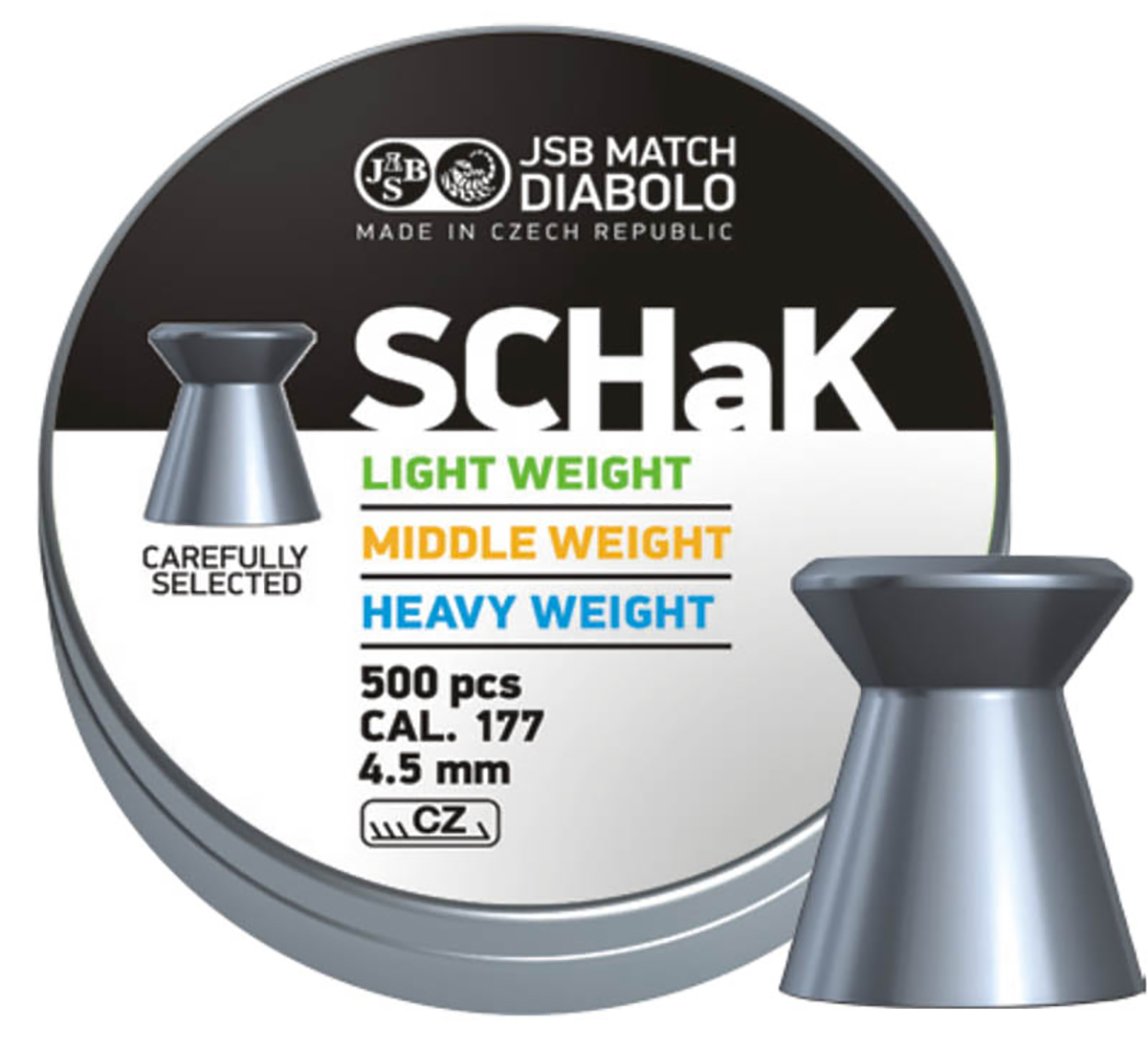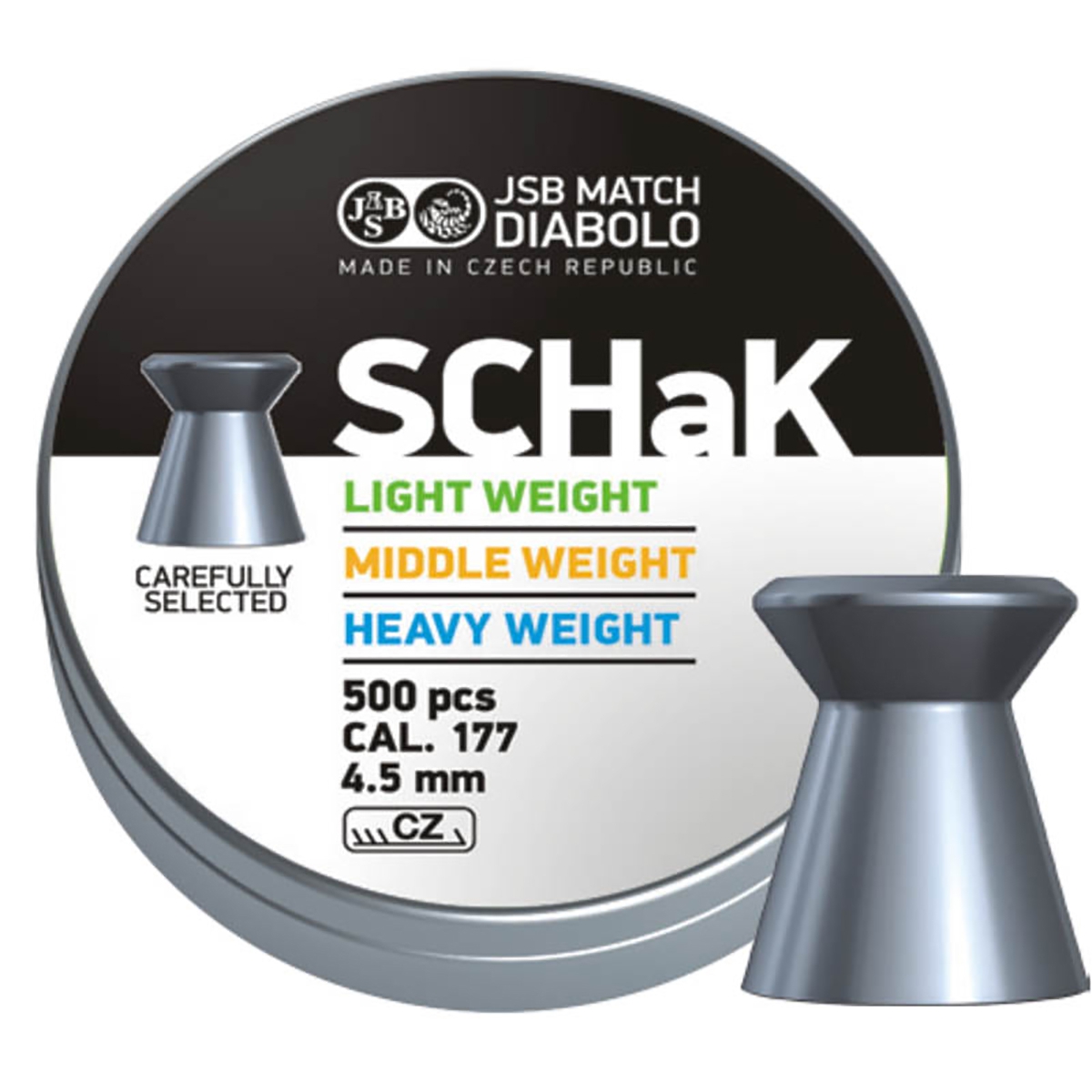 Śrut diabolo JSB SCHAK KAL. 4,49- model śrutu tarczowego czeskiego renomowanego producenta firmy JSB. Śrut wycina płaskie otwory w tarczy, dzięki czemu można z łatwością policzyć punkty. Dzięki płaskiem czole śrut umożliwia uzyskanie idealnie widocznych przestrzelin, nie poszarpanych.
