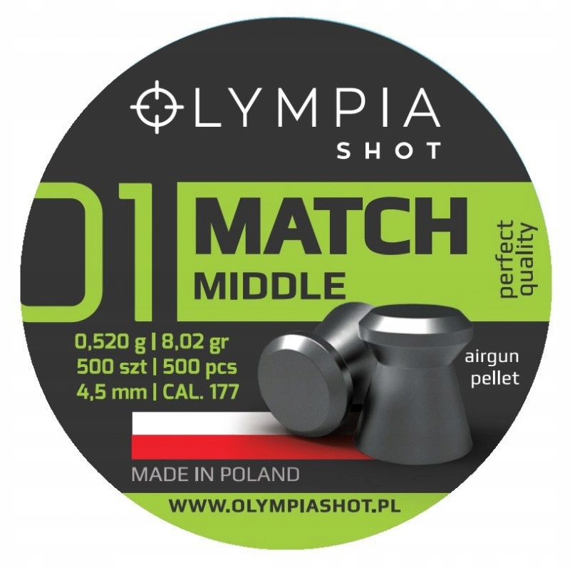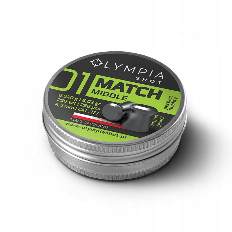 Śrut Olympia Shot Match Middle - płaski śrut tarczowy wyprodukowany przez polską firmę AP Polska Kiecoń. Polecany do strzelania tarczowego na krótkich dystansach.