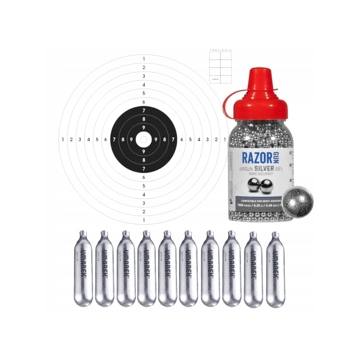Zestaw: Śrut stalowy BB kulki Razor 1500szt 4,46 mm 4,5 mm + tarcze 50 sztuk + 10 CO2