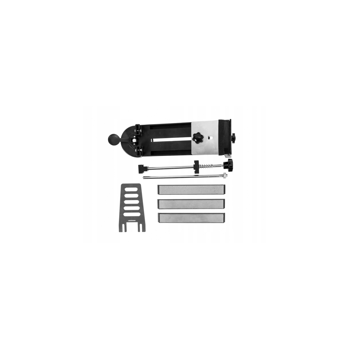 - Wyposażona w 3 płytki diamentowe, prowadnice z regulacją kąta w zakresie 10-30° oraz stabilną podstawę z przyssawką.
