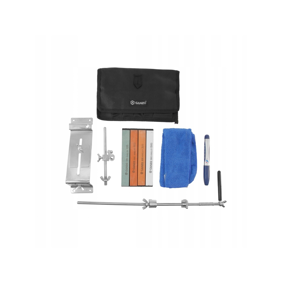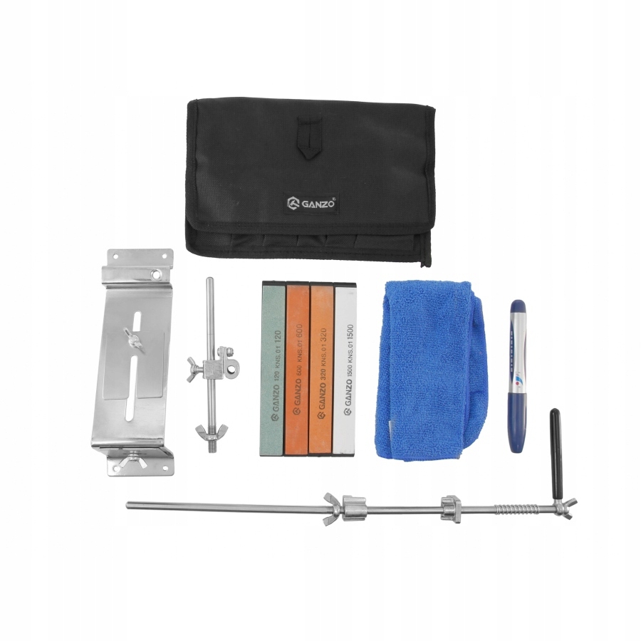 W komplecie: system ostrzący wraz z prowadnicami, 4 kamienie, marker, ściereczka czyszcząca oraz etui mieszczące cały system.