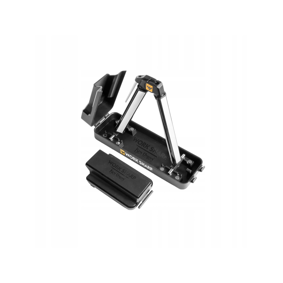 Work Sharp Angle Set składa się z dwóch kluczowych elementów, polimerowego pudełka pełniącego funkcję podstawy oraz obrotowego modułu ostrzącego.