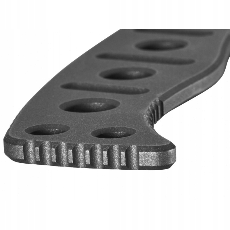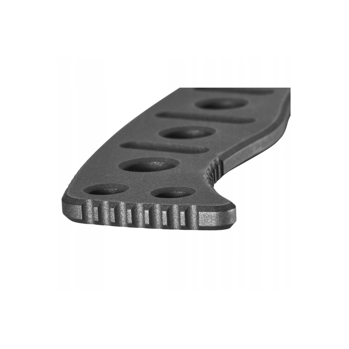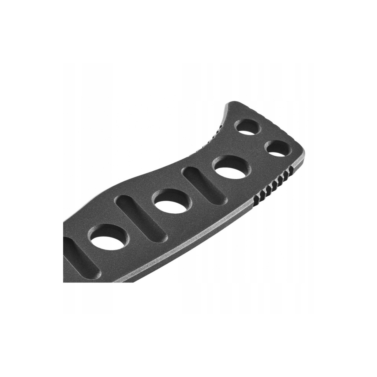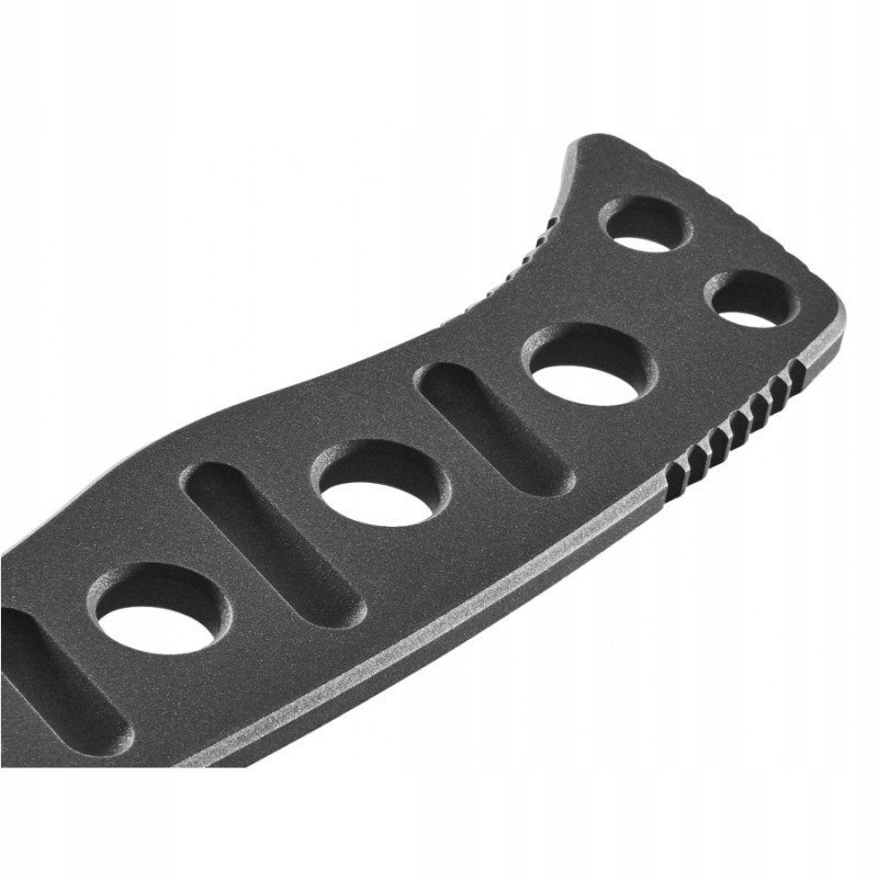 - Nóż ma szkieletową konstrukcję, pozbawioną typowych okładzin co pozwoliło na efektywne obniżenie ciężaru oraz zapewnia płaski profil. Na trzpieniu pełniącym funkcję rękojeści w newralgicznych miejscach wykonano poprzeczne frezy, zwiększające przyczepność noża.