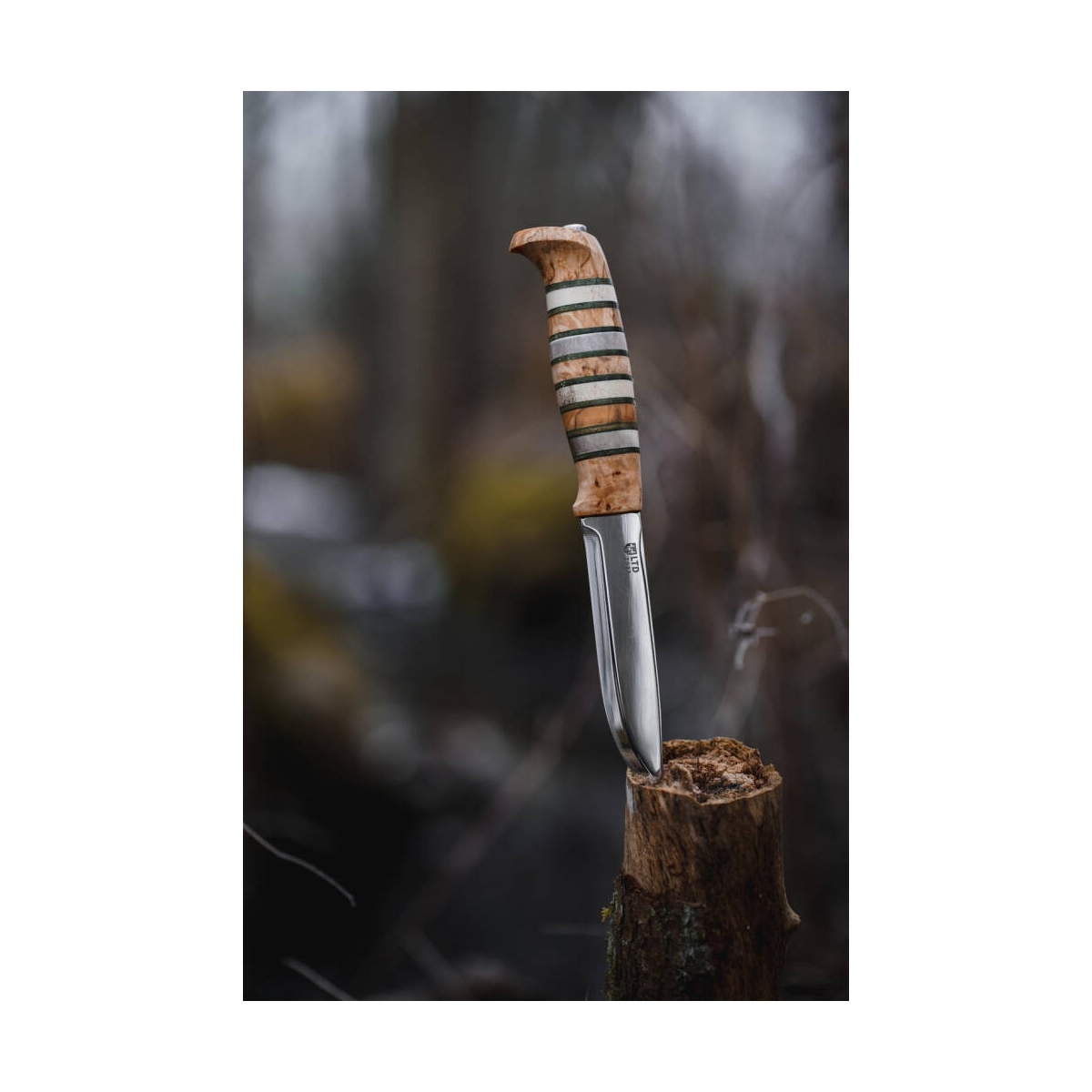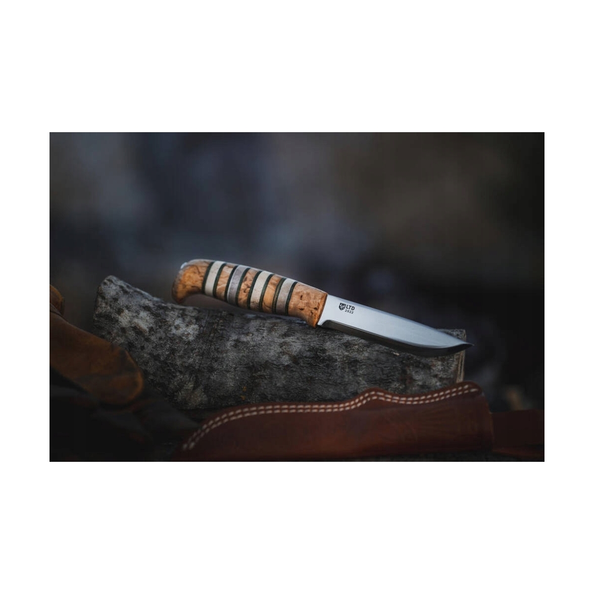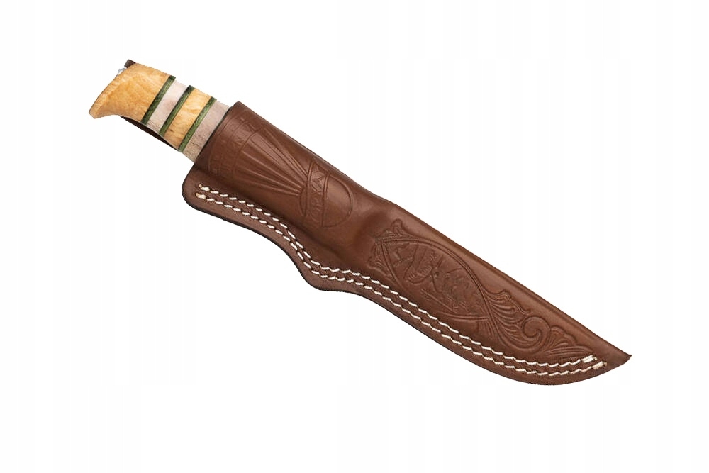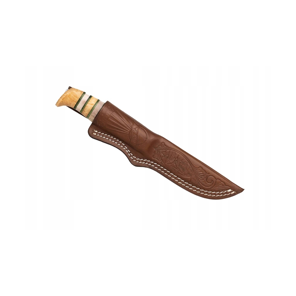 - Rękojeść: brzoza z wstawkami z poroża i zielonej skóry