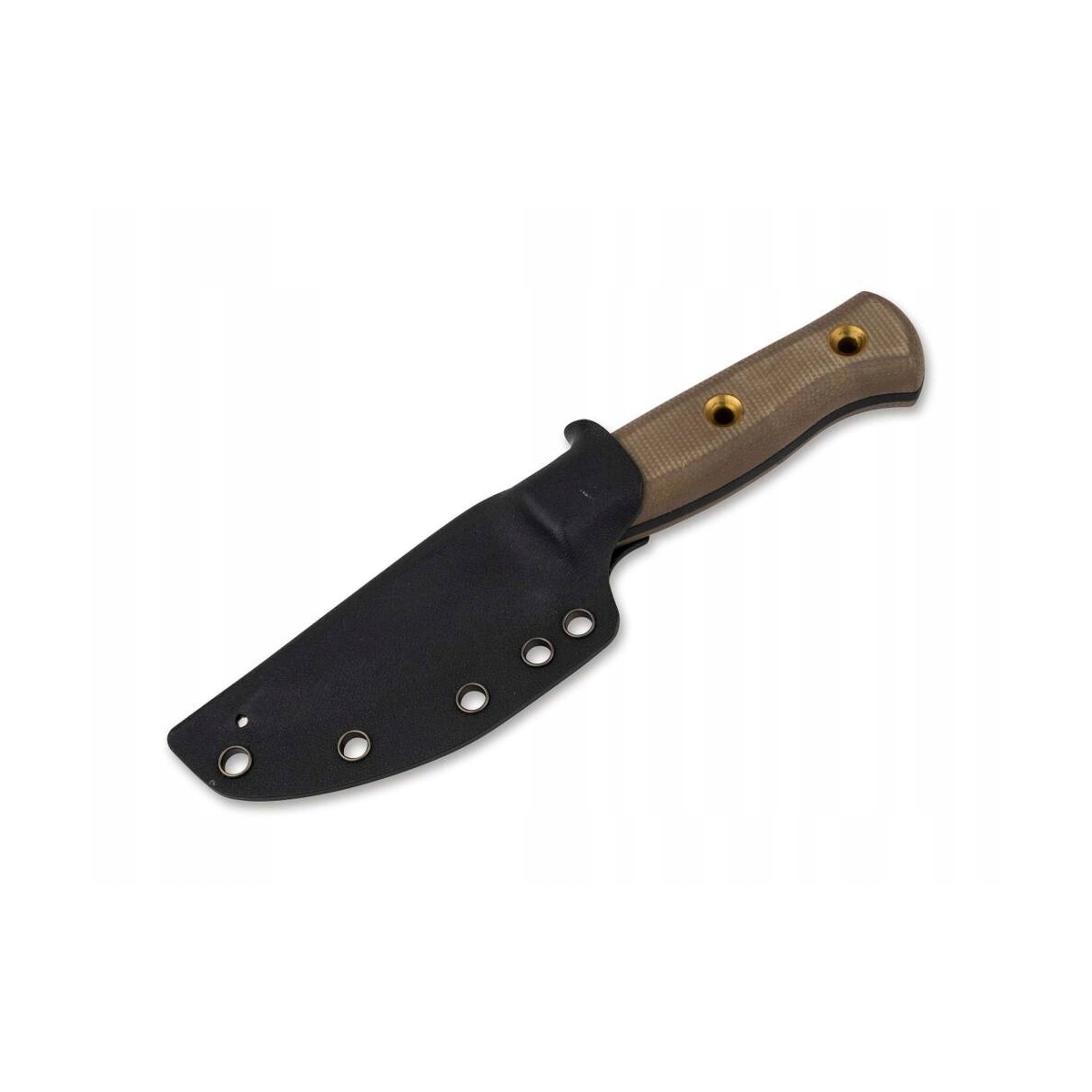 - Rękojeść wykonana z Micarty, kompozytowego materiału z bawełny lub lnu prasowanego pod ciśnieniem z syntetyczną żywicą. Fazowane krawędzie okładek eliminują ostre krawędzie dla wygody, a podcięcie na palec poprawia pewność uchwytu. Okładziny są mocowane wprost do głowni przy pomocy nitów przelotowych, które mogą służyć również do przewleczenia linki mocującej. Konstrukcja niezwykle prosta i wytrzymała, doskonale wpasowująca się w filozofię bushcraftu.