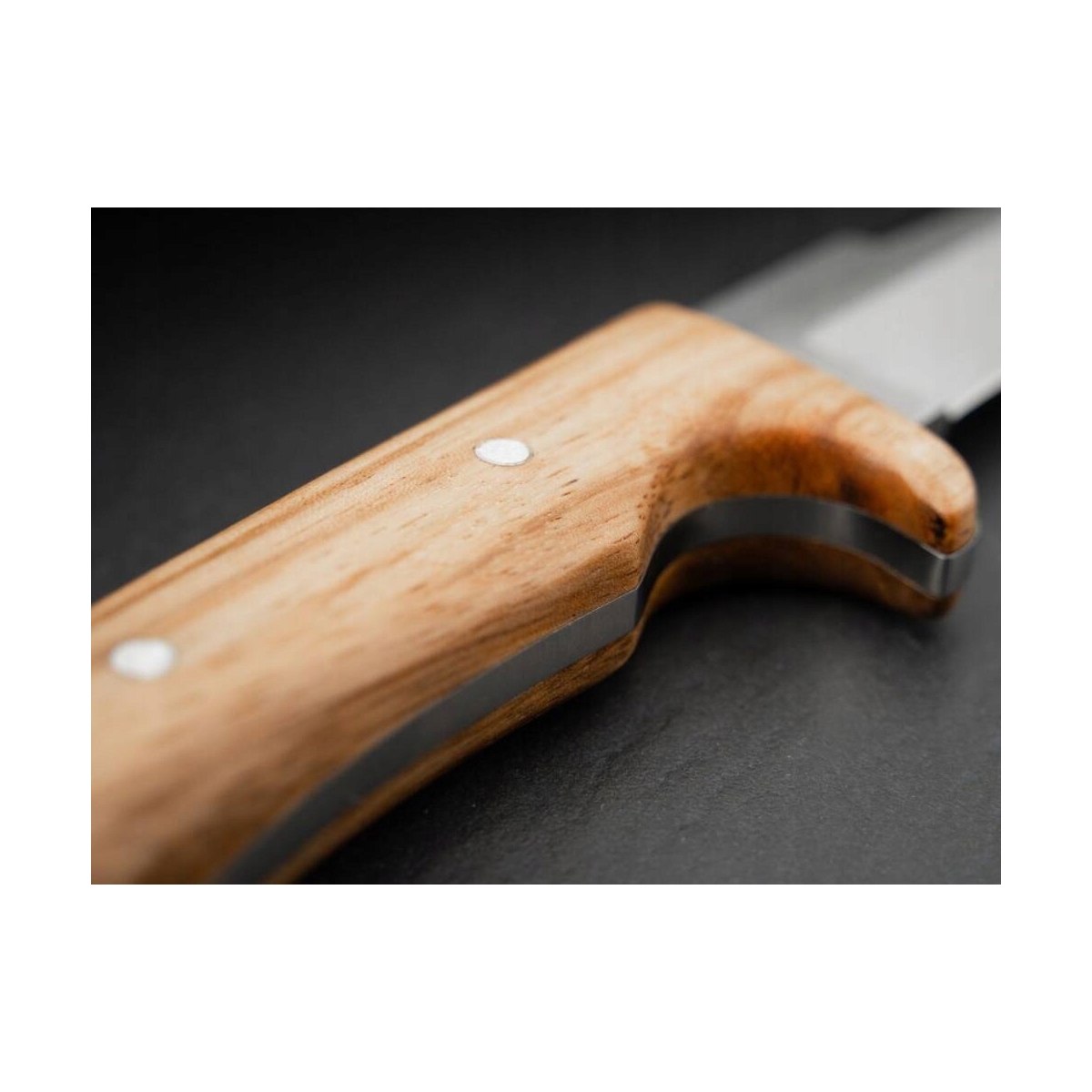 - Okładziny ergonomicznie wyprofilowanej rękojeści wykonano z twardego i odpornego na warunki zewnętrzne drewna zebrawood.