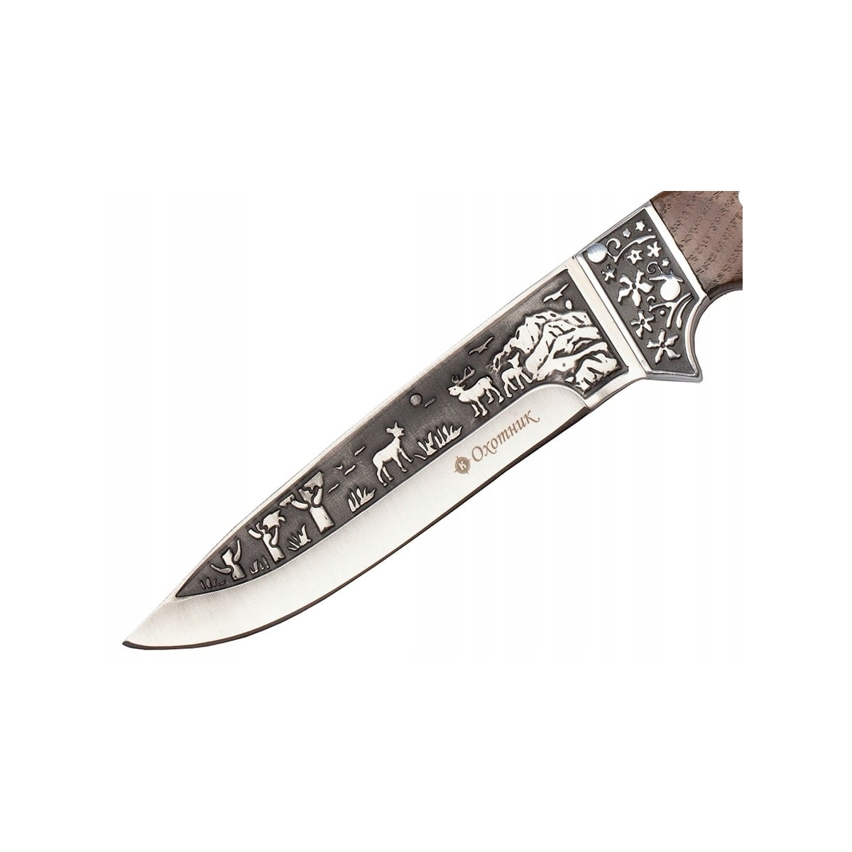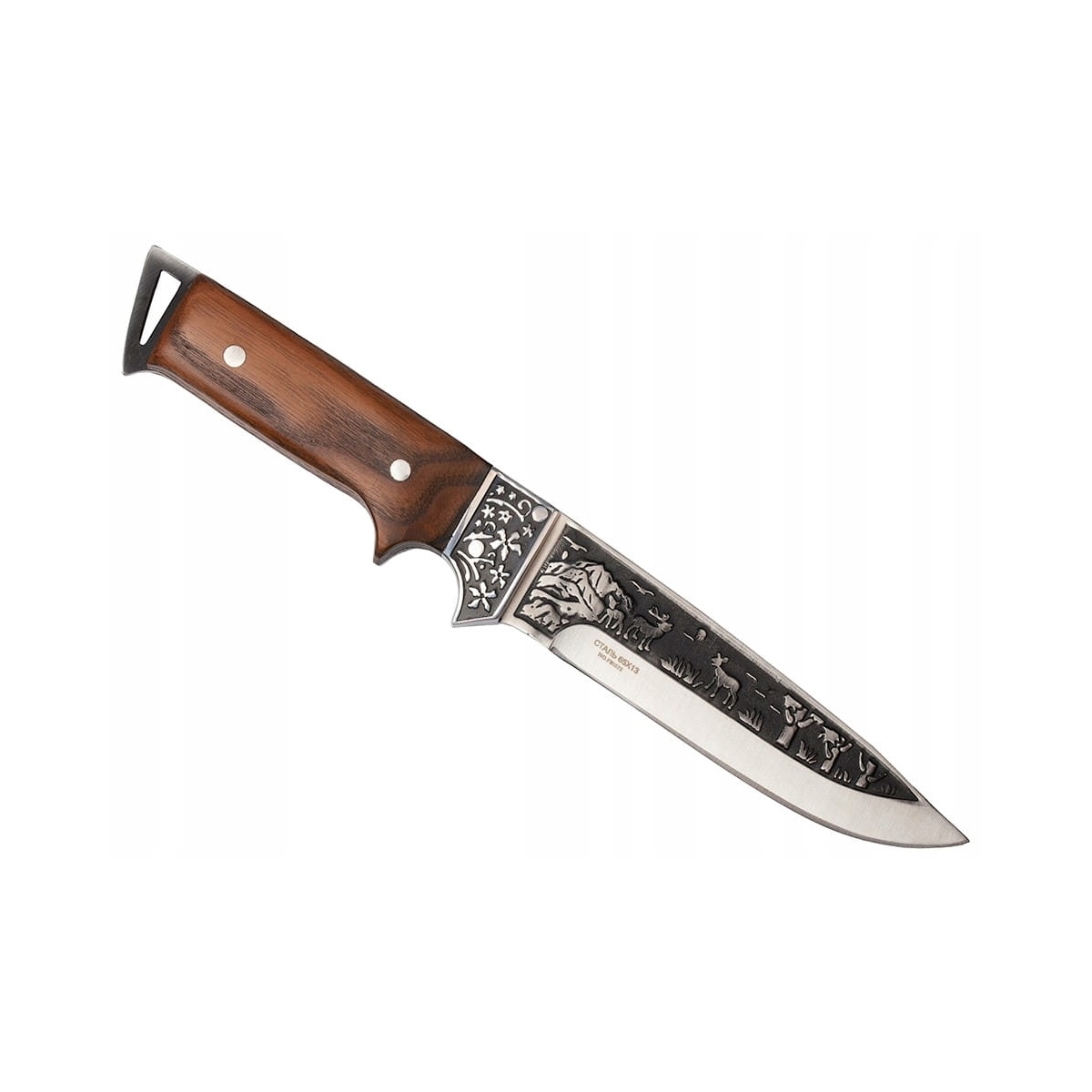 - Głownia o profilu drop point została bogato zdobiona grawerem przedstawiającym wizerunek jeleni na tle gór i lasów.