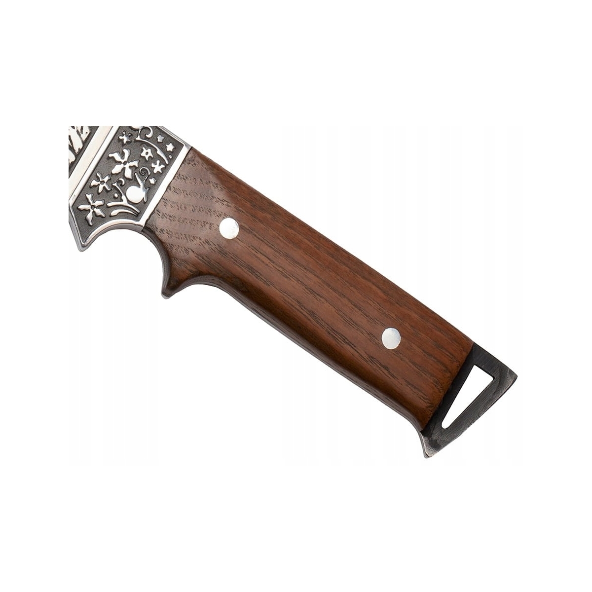 - Nóż wyposażony został w podcięcie na palec, pomaga ono w precyzyjnym manewrowaniu nim, oraz w skutecznie chroniący dłoń metalowy jelec, który został pokryty florystycznym ornamentem.