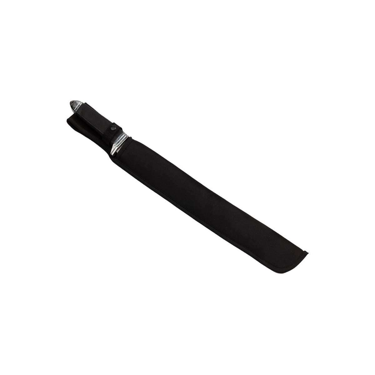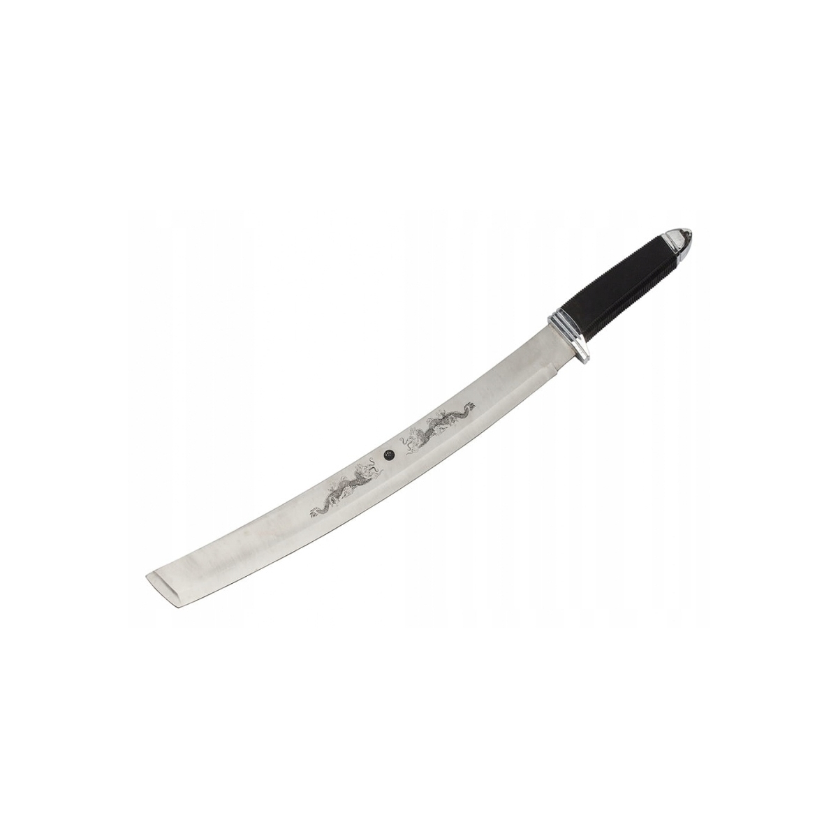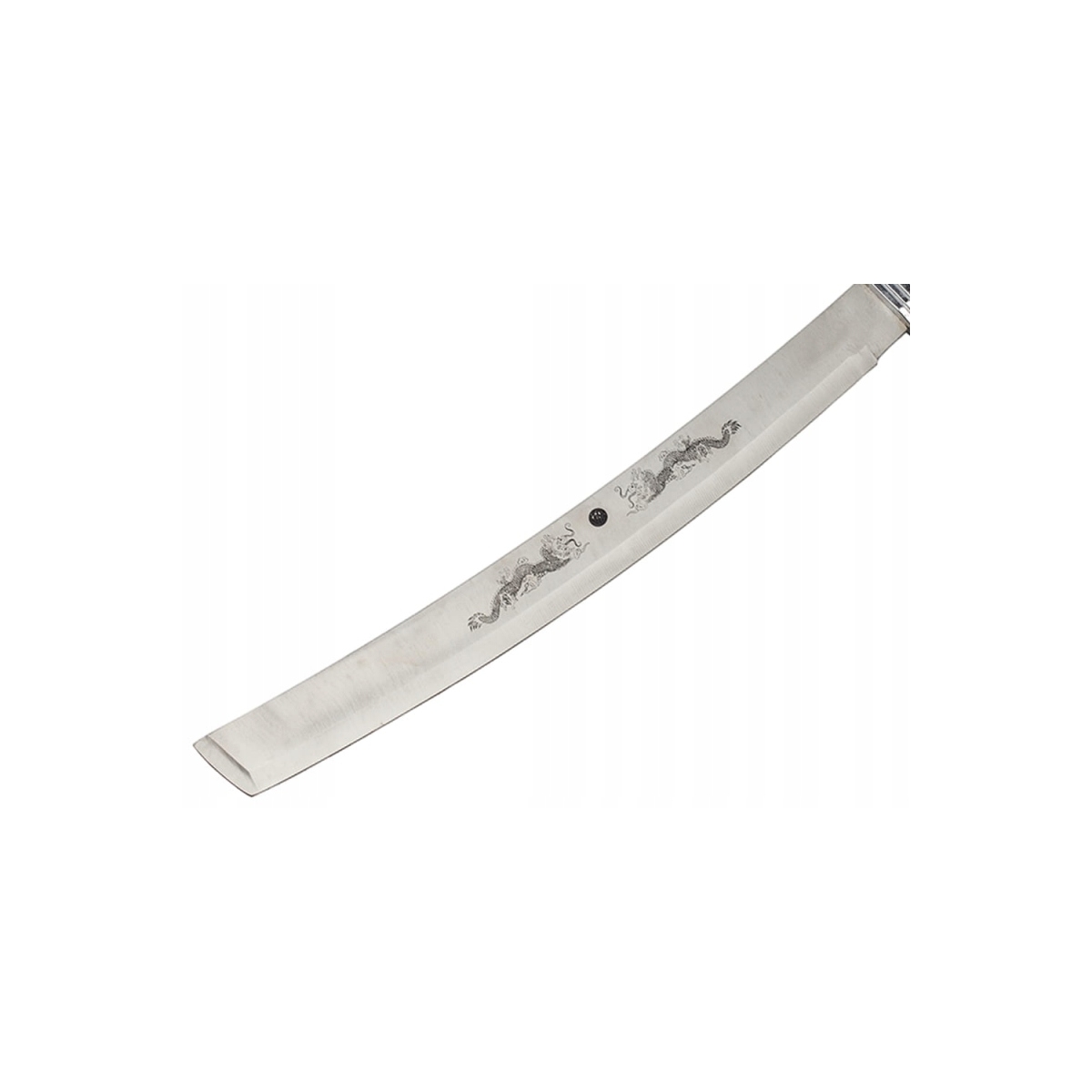- Klasycznie zakrzywiona głownia została wykonana ze stali i ozdobiona nadrukiem przedstawiającym dwa japońskie, tradycyjne smoki.