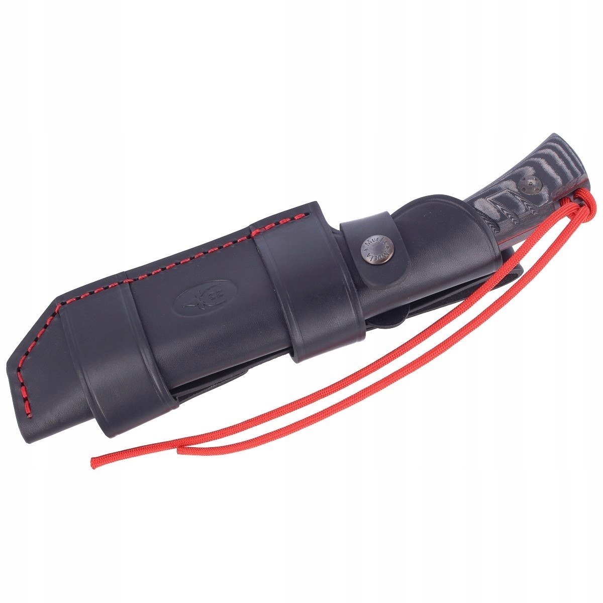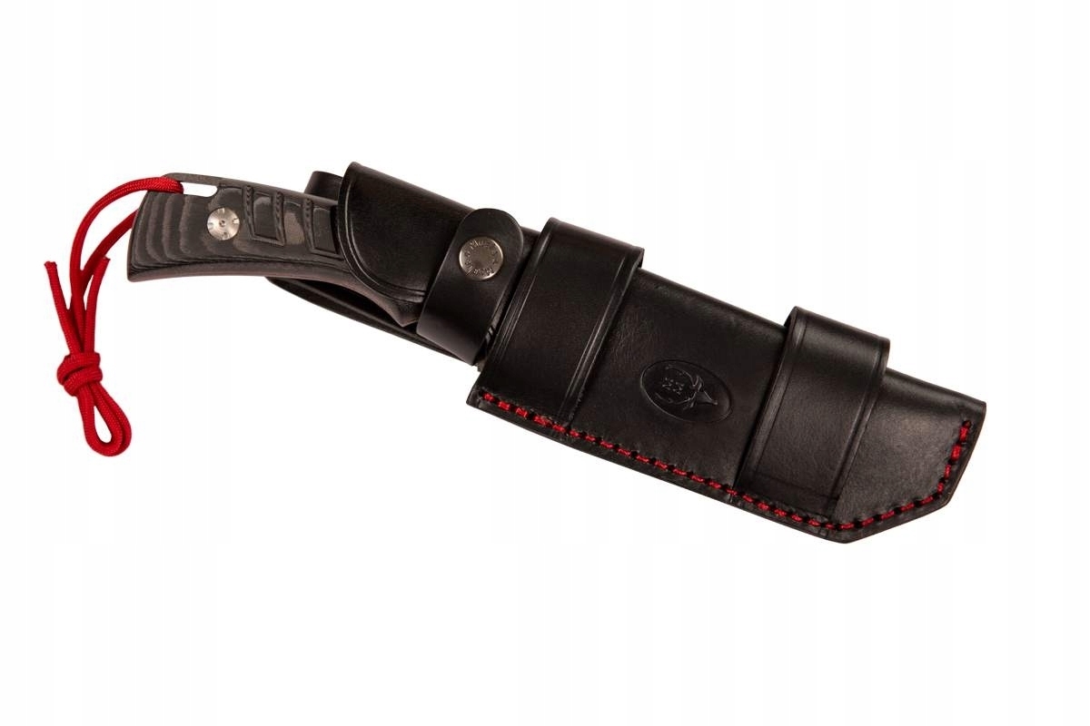 Zestaw zawiera ręcznie szytą pochwę wykonaną z naturalnej skóry w kolorze czarnym z tłoczonym logo producenta.