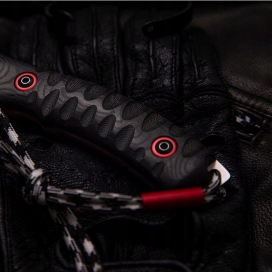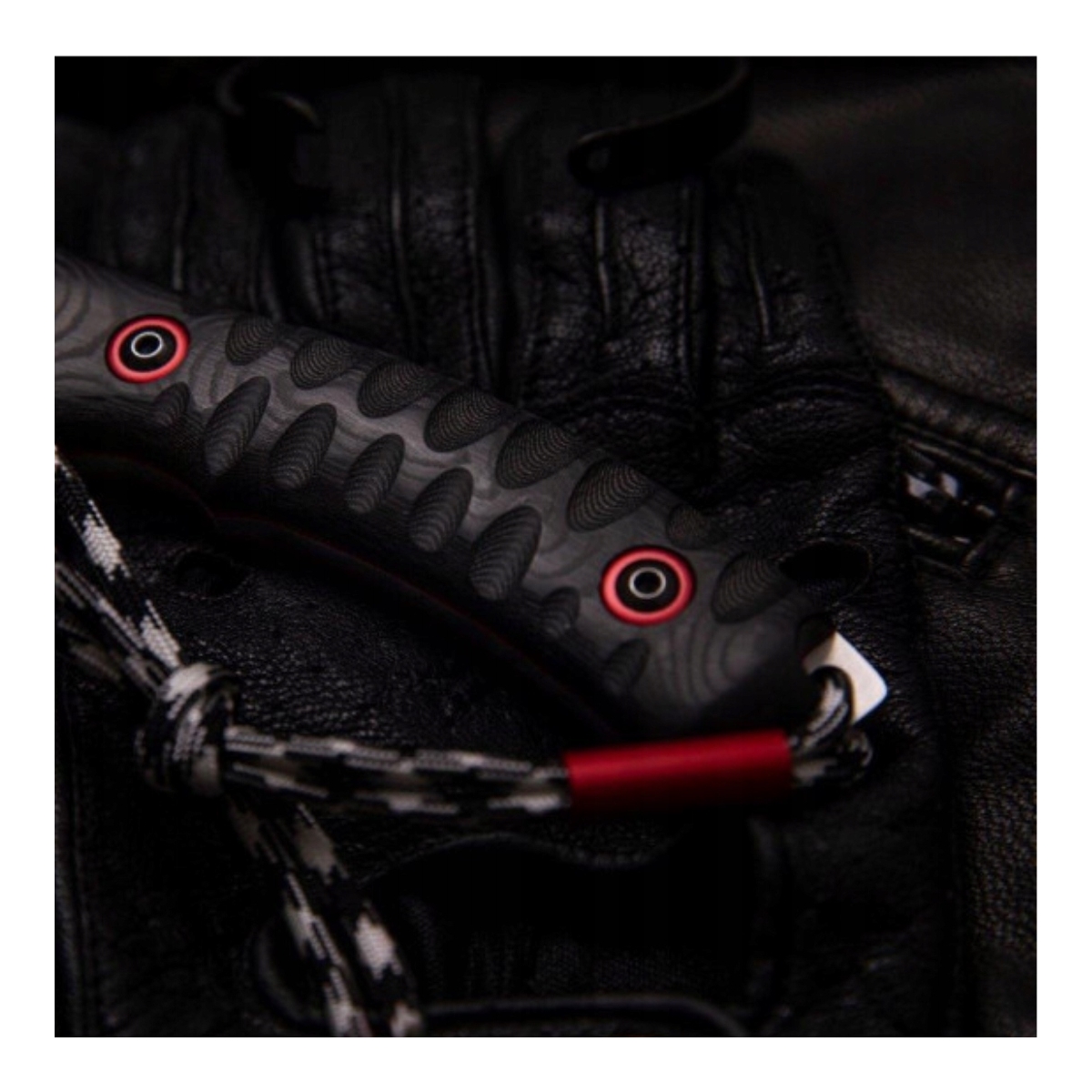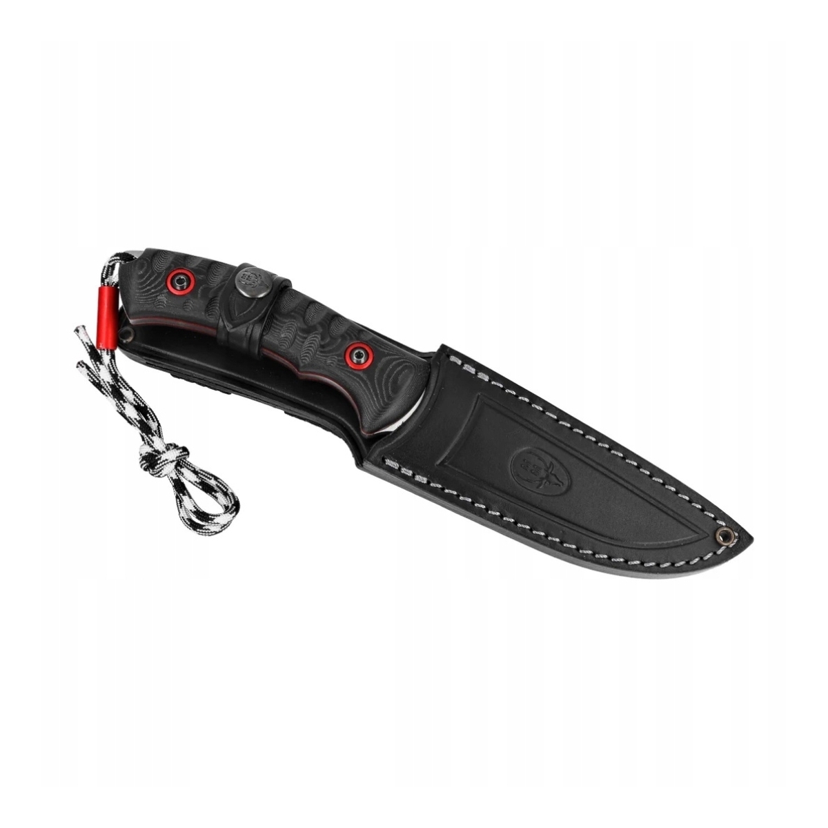 Przenoszenie noża w pozycji pionowej ułatwia mocowanie do pasa oraz zawieszka z linki i metalowej tulei w kolorze czerwonym.