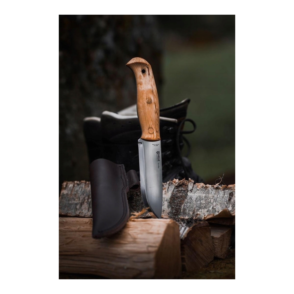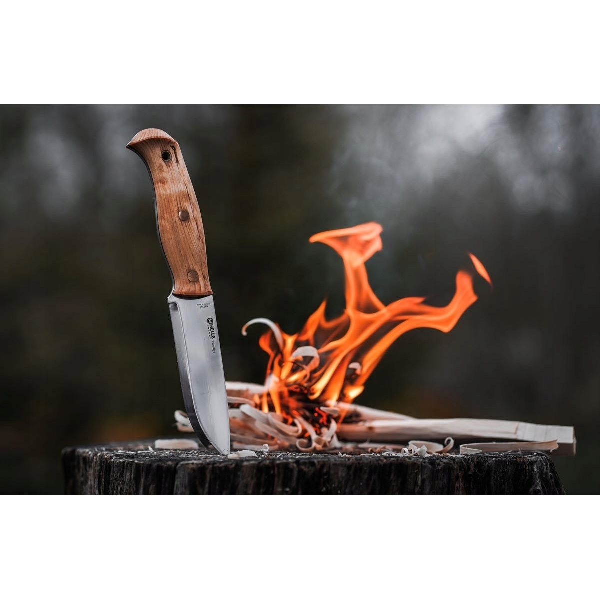 Model ten opracowano tak, aby był to najlepszy i wszechstronny nóż outdoorowy. Dzięki ostrzu ze stali nierdzewnej 14C28N Alleima o grubości 3,1 mm i długości 12,2 cm nóż sprosta większości stawianych wyzwań. Wciąż wystarczająco cienki do cięcia, a równocześnie wystarczająco mocny do rąbania gałęzi czy przygotowywania podpałki.