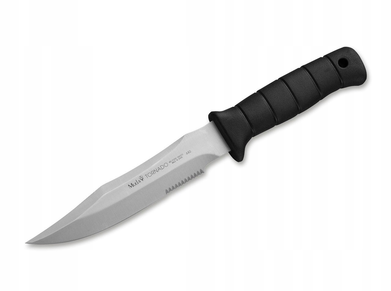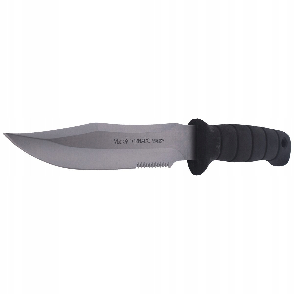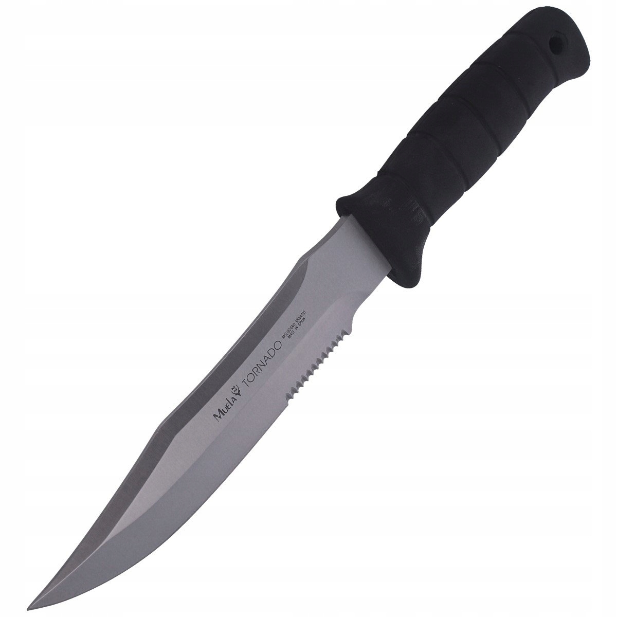 Nóż Muela Tornado-18W - to uniwersalny nóż stały, o konstrukcji Full Tang. Posiada częściowo ząbkowane ostrze typu Combo o długości 18 cm, wykonane ze stali molibdenowo-wanadowej MoVa. Ten masywny nóż z głownią o grubości 5,2 mm wytrzyma duże obciążenia, z powodzeniem może być wykorzystany jako taktyczny, survivalowy, myśliwski, EDC.
