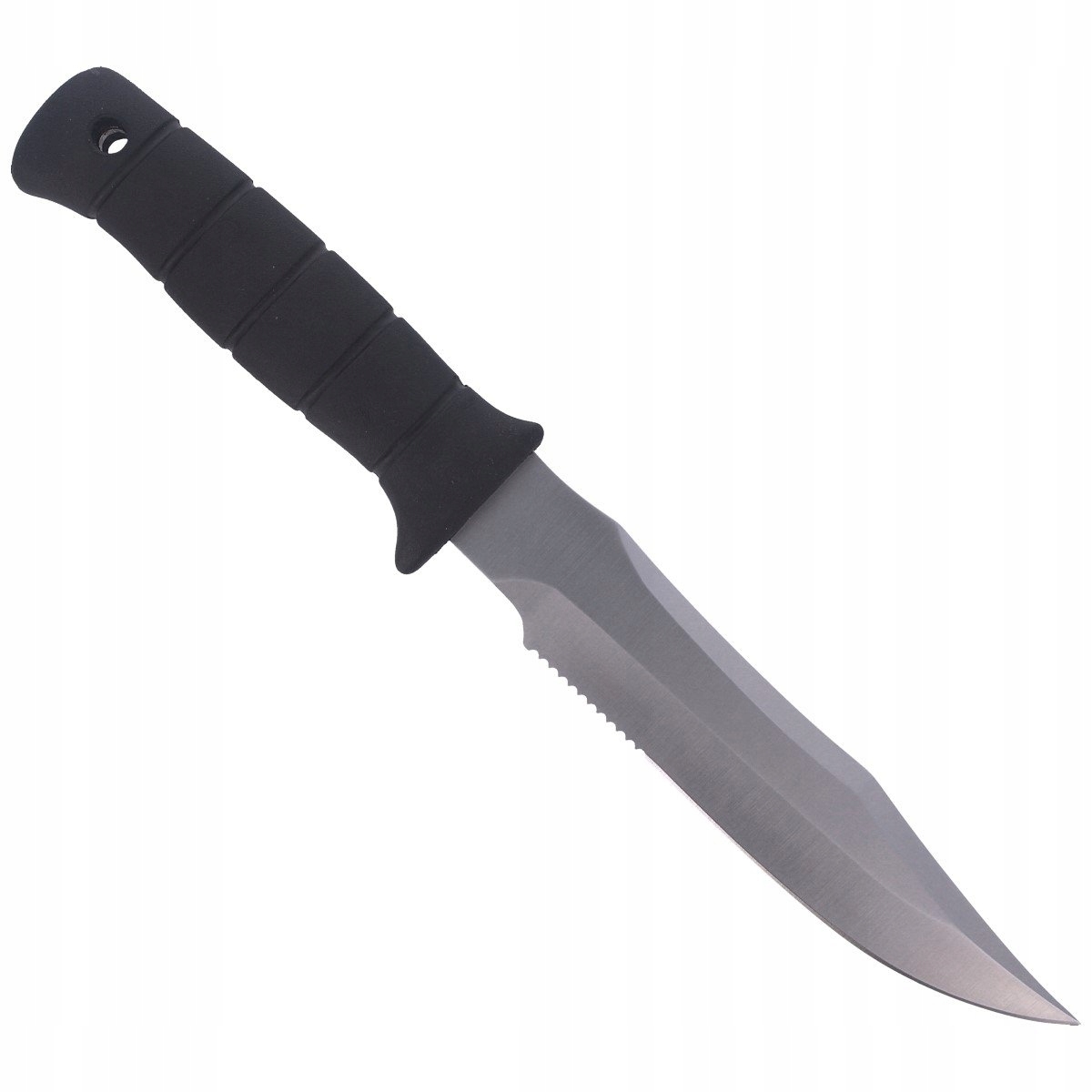 - Rękojeść - moletowana, pokryta utwardzaną syntetyczną gumą w kolorze czarnym, gwarantuje bardzo dobrą przyczepność. Nóż nie wyślizguje się z dłoni, a mocny i pewny chwyt pozwala na wykonywanie precyzyjnych ruchów nożem. W tylnej części rękojeści znajduję się powiększony otwór na linkę.