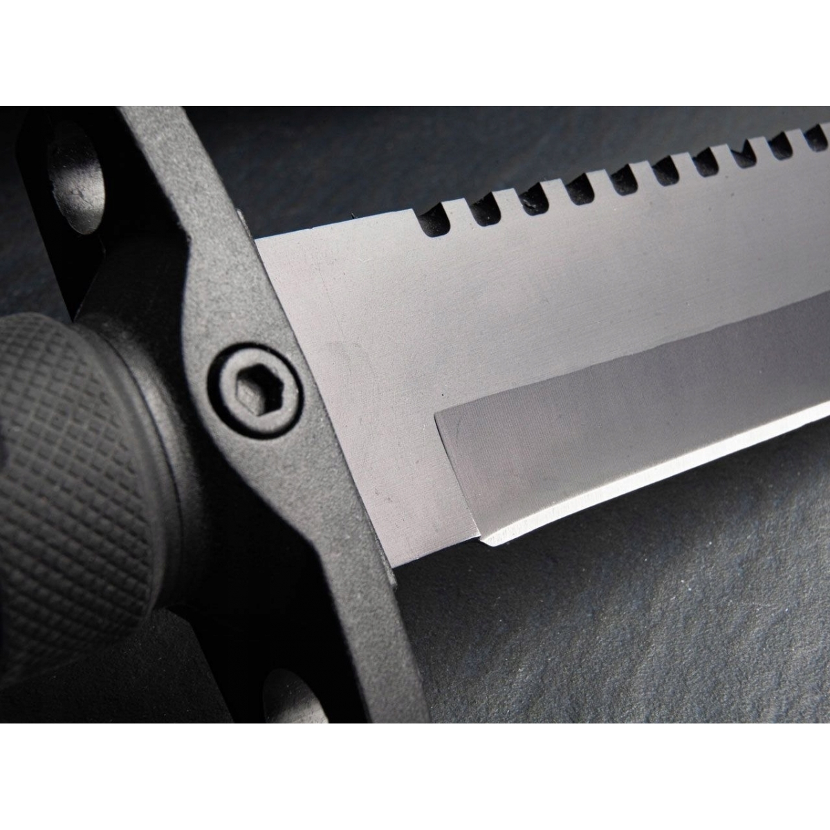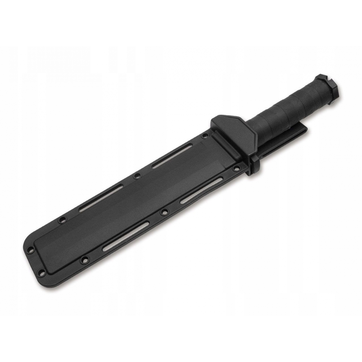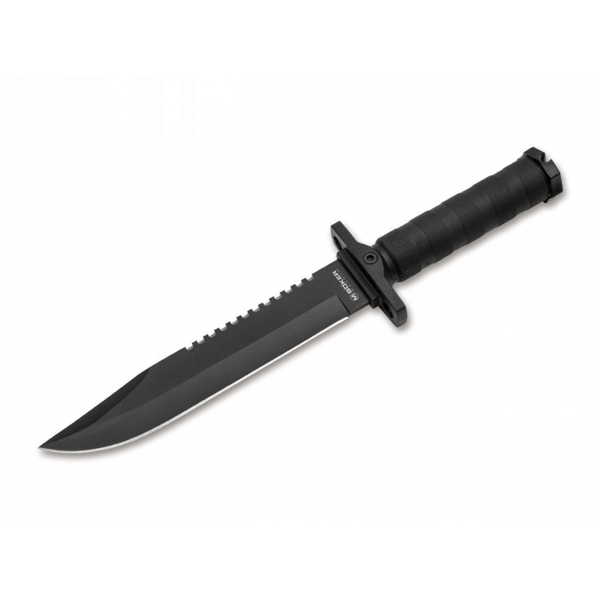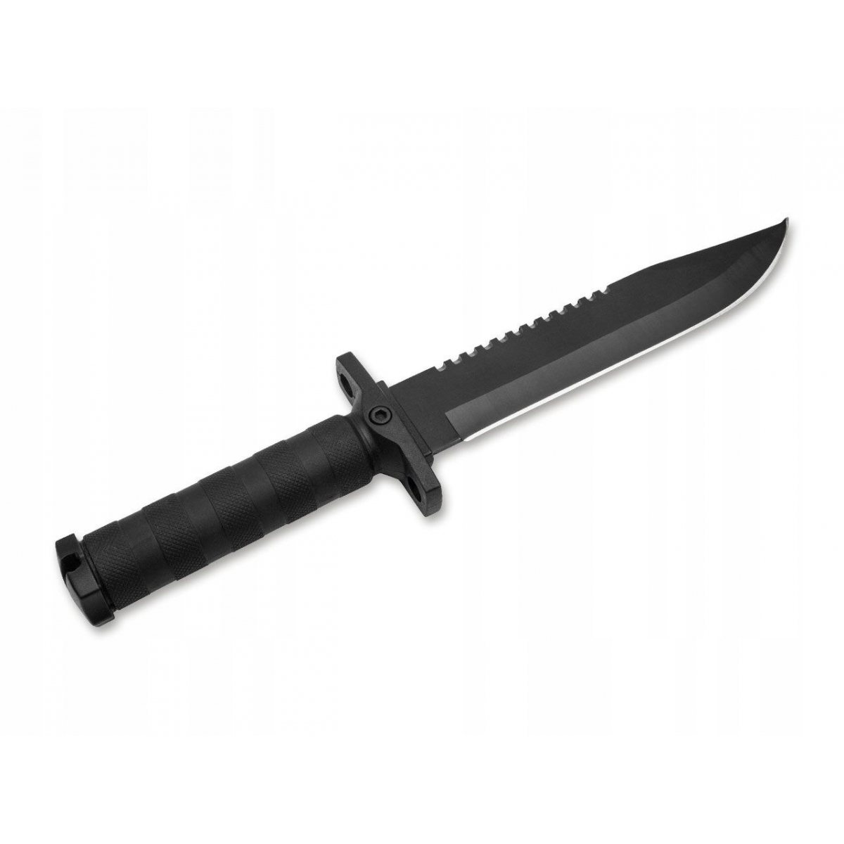 uchwyt wykonany z niezniszczalnego FRN. Dzięki dodatkowej gumowej powłoce antypoślizgowy uchwyt zawsze pewnie leży w dłoni, nawet w mokrych warunkach, a symetryczny element parowania dodatkowo zwiększa bezpieczeństwo pracy. Otwory w osłonie dłoni umożliwiają przymocowanie noża za pomocą sznurka, drutu, opasek kablowych lub taśmy tekstylnej, dzięki czemu można go również użyć na przykład jako prowizorycznej włóczni. Potężne ostrze Bowie wykonane ze stali nierdzewnej i odpornej na wstrząsy 7Cr17MoV jest pomalowane na czarno i dodatkowo wyposażone w typową piłę tylną. Idealnie dopasowana czarna, plastikowa pochwa, dzięki licznym otworom, oferuje szerokie możliwości zapinania odzieży i sprzętu, podczas gdy sama szlufka jest zaprojektowana jako zintegrowany klips. Z praktycznym otworem na smycz w pokrętle końcowym.
