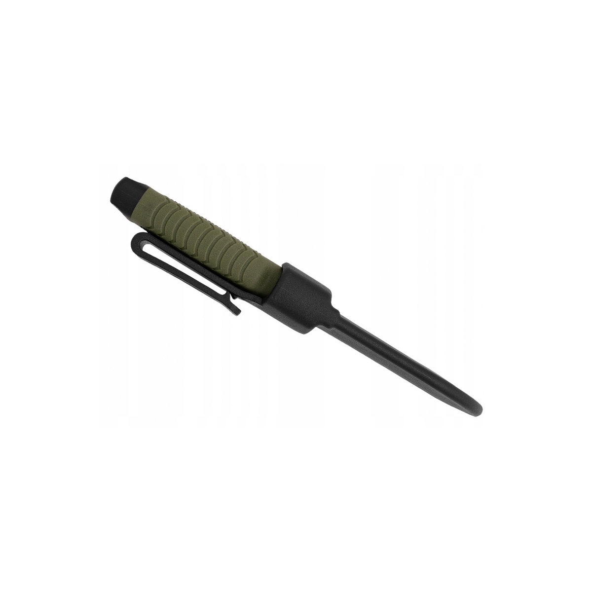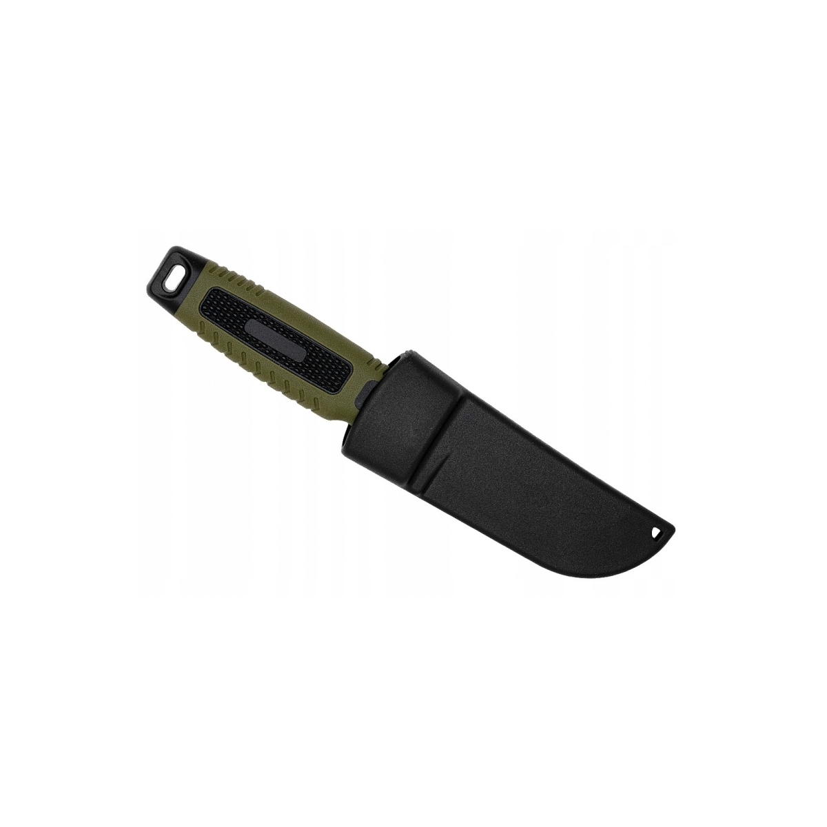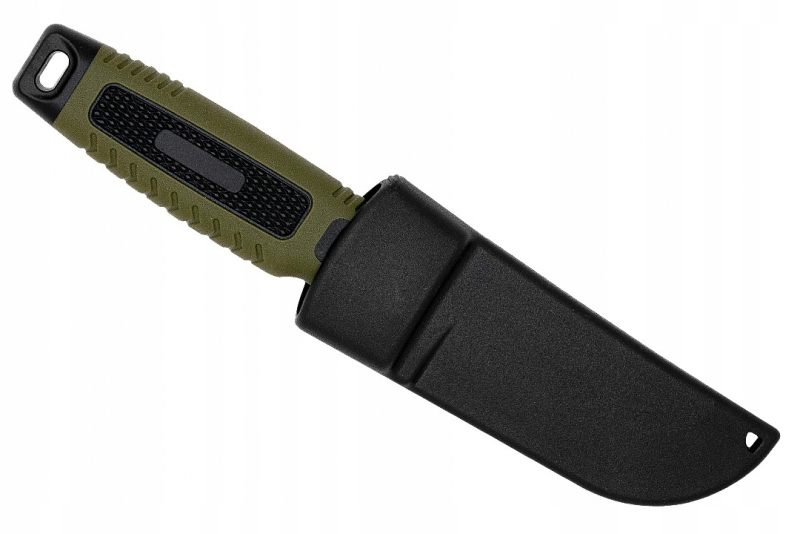 Ergonomiczna rękojeść, wykonana z tworzywa gumopodobnego, zapewnia komfortowy, pewny chwyt, a jej konstrukcja została dodatkowo zoptymalizowana pod kątem właściwości antypoślizgowych. Na końcu chwytu znajduje się otwór, który umożliwia przewleczenie sznurka, co pozwala na łatwiejsze zabezpieczenie noża.