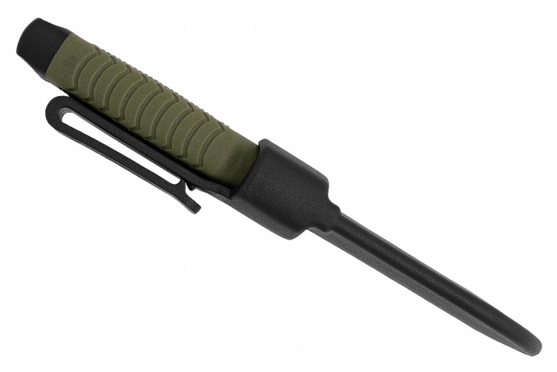 Nóż wyposażono także w solidny czarny pokrowiec, który można przymocować do paska za pomocą specjalnego zaczepu.