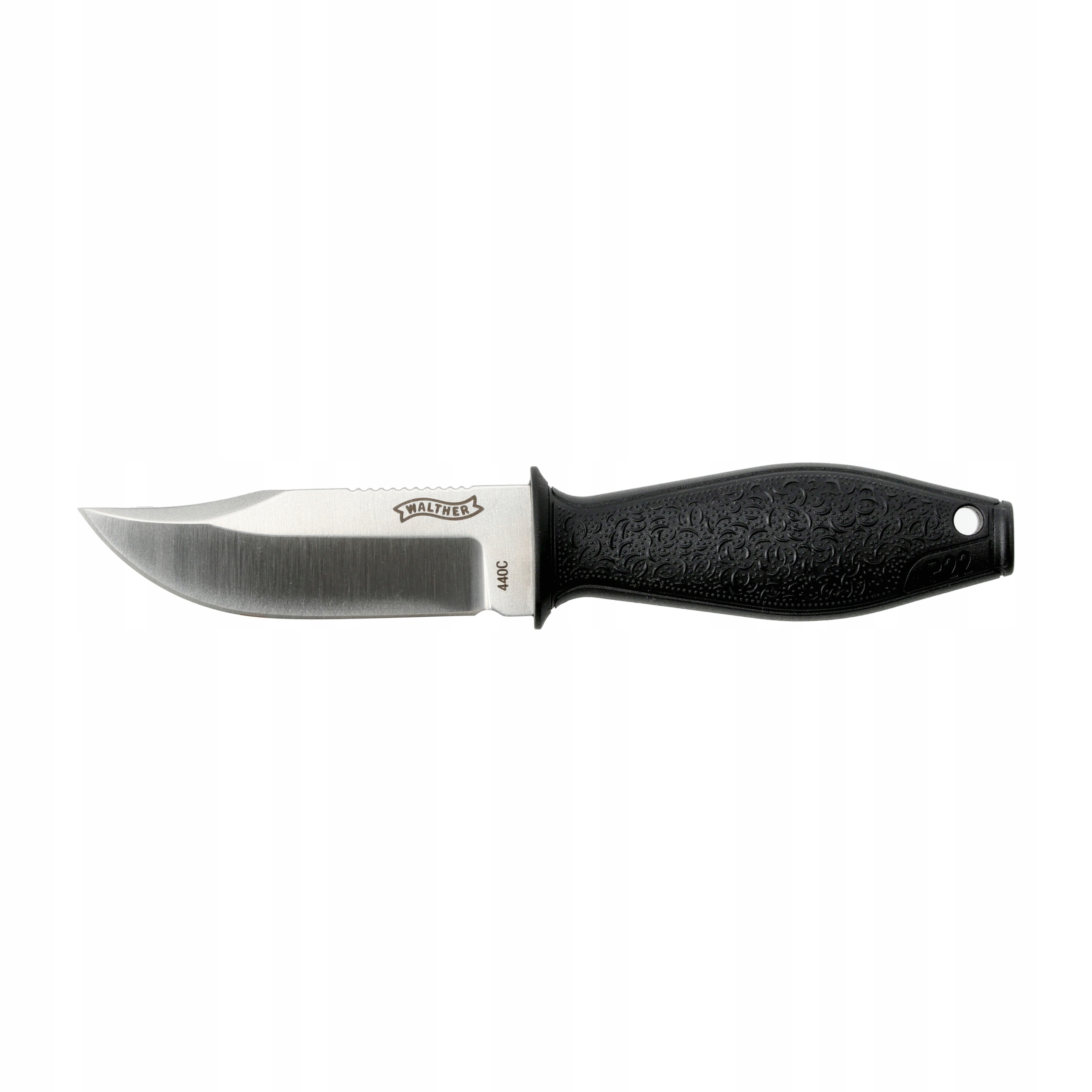 Antypoślizgowe teksturowanie rękojeści jest identyczne z tym jakie producent nanosi na tylnej nakładce chwytu w pistolecie Walther P22. Drobne, nieregularne teksturowanie zapewnia doskonałą przyczepność i zapobiega wyślizgiwaniu się noża ze spoconej lub mokrej dłoni. W tylnej części chwytu znajduje się zaczep pozwalający na mocowanie linki lub smyczy. Do przenoszenia noża służy nowoczesna pochewka z Kydexu, która umożliwia wygodne noszenie go w roli neck knife lub przymocowanie paracordem do oporządzenia.