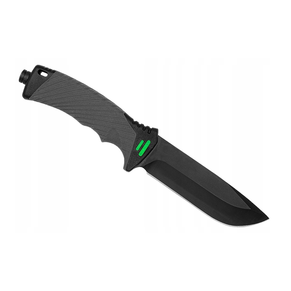 - Głownia z Powłoką Ochronną: Głownia o uniwersalnym profilu Drop Point została wykonana ze stali nierdzewnej typu 440. Stal ta zapewnia dobrą równowagę między trzymaniem ostrości a odpornością na korozję. Głownia pokryta jest czarną powłoką ochronną, która eliminuje odblaski (ważne w zastosowaniach taktycznych) oraz dodatkowo wzmacnia odporność na rdzę.