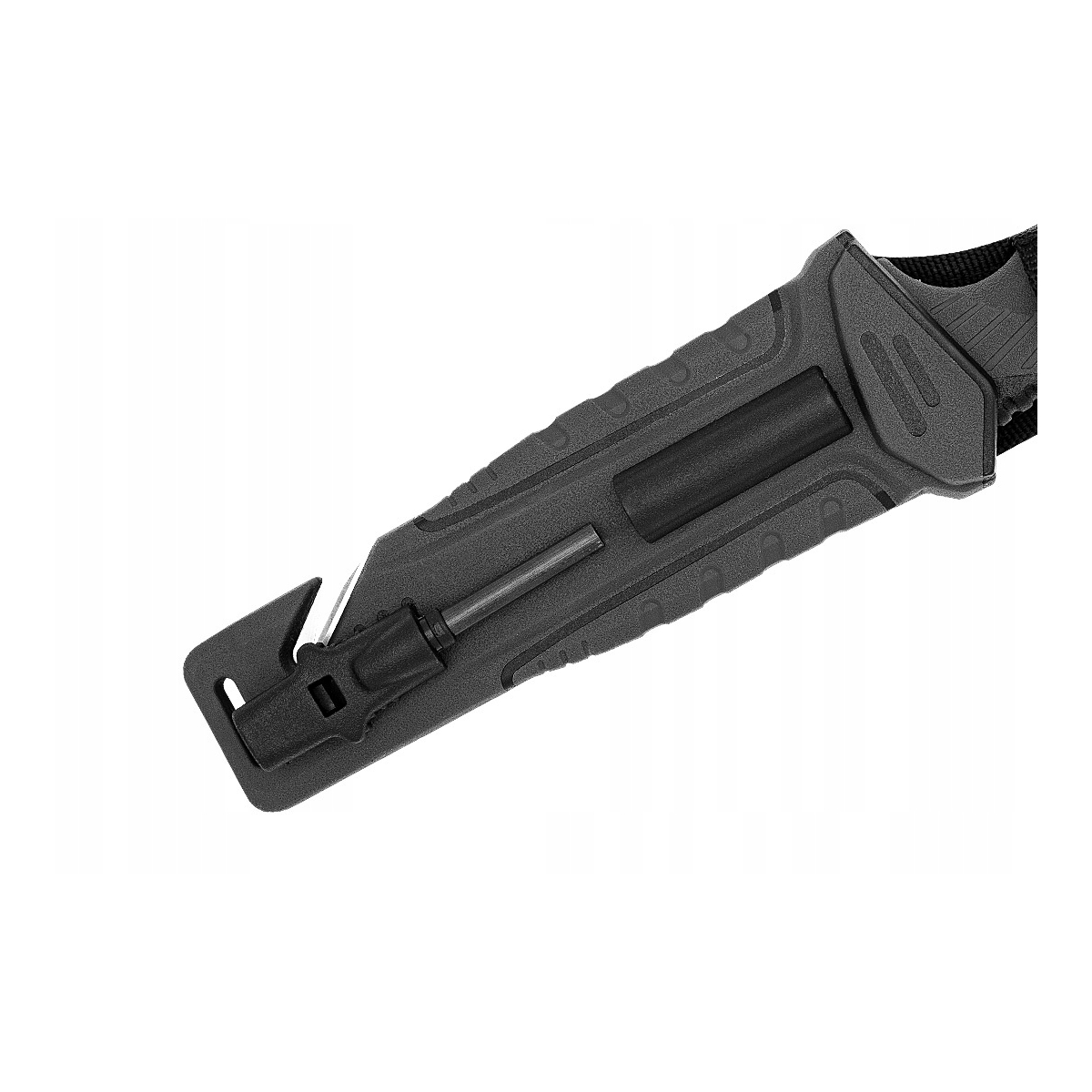 Pochwa noża jest nie tylko elementem do przenoszenia, ale pełni funkcję wielofunkcyjnego zasobnika, w którym mieszczą się wszystkie niezbędne akcesoria: