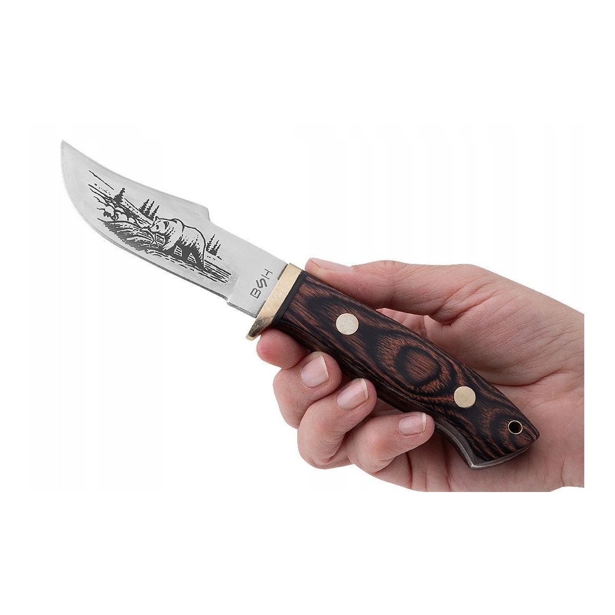 - Wzornictwo: Głownia jest obustronnie zdobiona wizerunkiem niedźwiedzia, co nadaje nożowi myśliwski, estetyczny charakter.