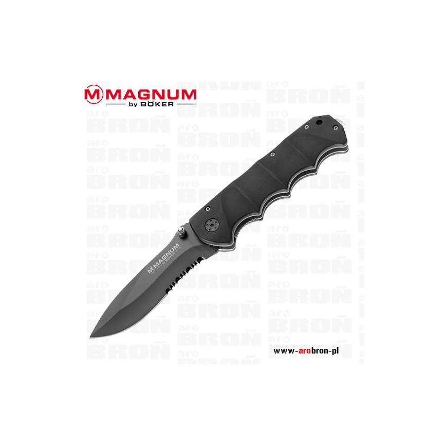 Nóż BOKER Magnum BLACK SPEAR 01RY247 - składany, duży nóż niemieckiego producenta Boker. Klinga typu Recurve częściowo ząbkowana wykonana ze stali nierdzewnej 440A. Rękojeść z aluminium zakończona zbijakiem do szyb.