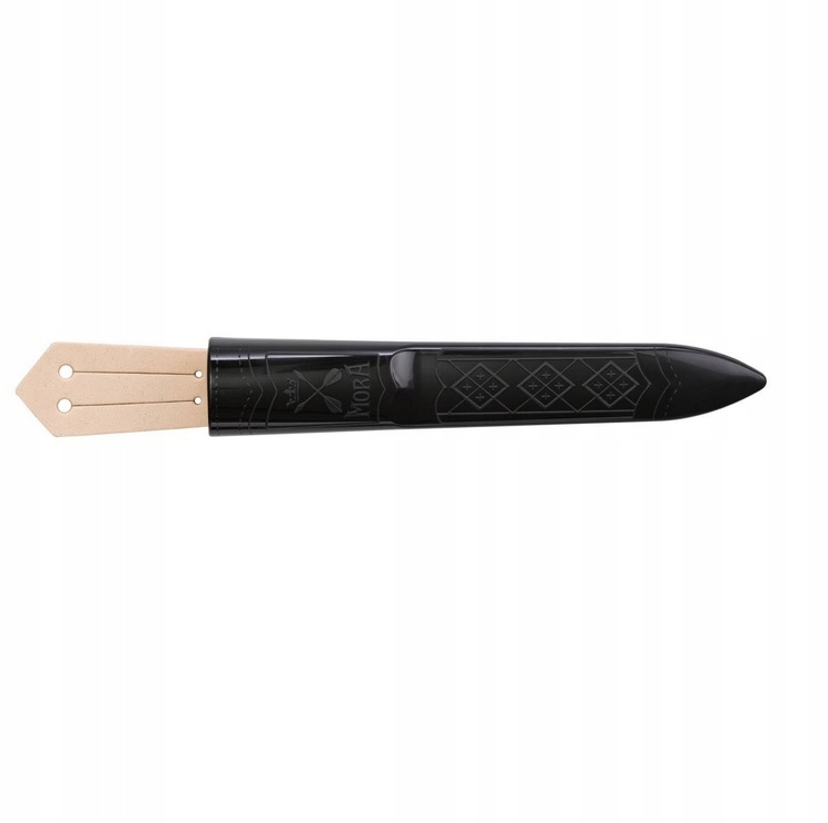 W zestawie znajduje się polimerowa, polerowana pochwa z tarczą Dalecarlian. Szlufka na pasek wykonana została ze szwedzkiej garbowanej skóry. Całość zaprojektowana została tak, by przetrwać najtrudniejsze zadania.