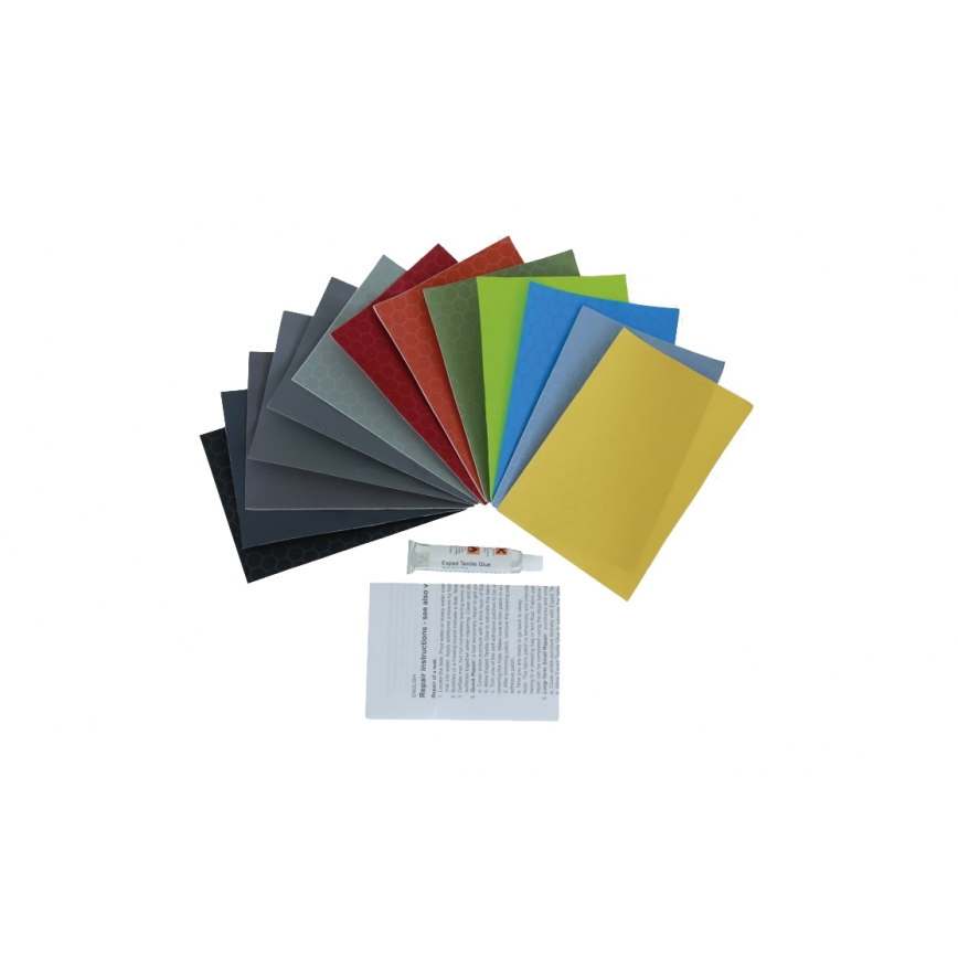 Obszerny zestaw naprawczy dla mat Exped potrzebny by naprawić nieszczelności, dziury i nacięcia. Zawiera 18 prostokątnych łatek samoprzylepnych w odpowiednich dla mat kolorach, 1 tubkę z klejem PU oraz szczegółową instrukcję.