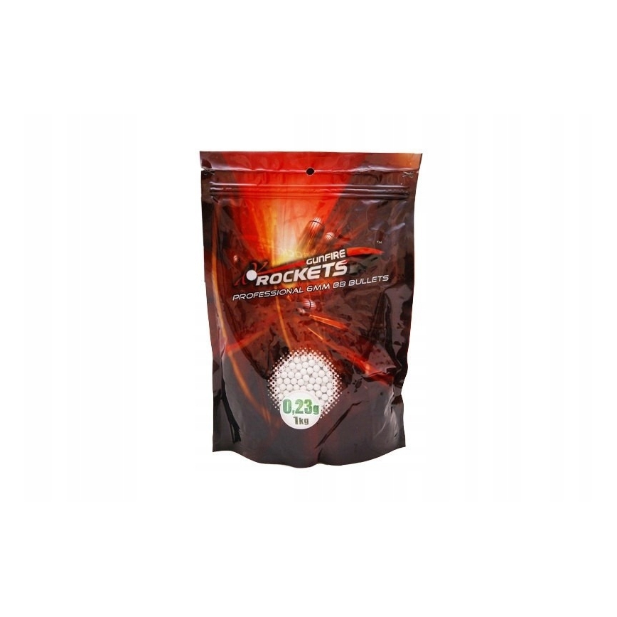 Kulki ASG Rockets Professional 0,23g 1kg- wysokiej jakości, precyzyjne kulki ASG. Przeznaczone są do każdego rodzaju luf, także precyzyjnych.Charakteryzują się dobrym skupieniem strzałów. Kulki polerowane są na wysoki połysk i powleczone są specjalną warstwą zmniejszającą tarcie. Dobrze rozłożony środek ciężkości wewnątrz każdej kulki wpływa na dobrą powtarzalność strzałów.