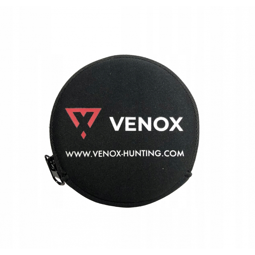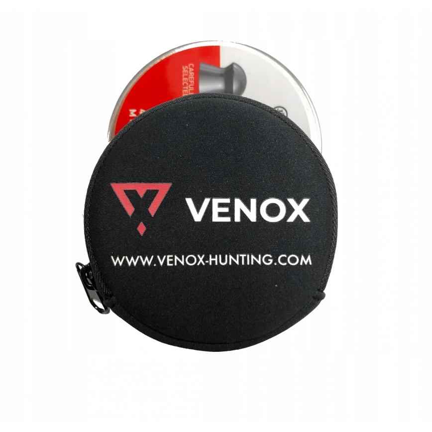 Etui Venox na śrut - oryginalne, neoprenowe etui na opakowanie śrutu. Zamykane na zamek, miękkie. Zabezpiecza opakowanie śrutu przed otworzeniem, rozsypaniem się śrutu oraz niewielkim uderzeniem. Maksymalna średnica opakowania, jakie zmieści się do środka to ok. 7cm. Pasuje np.: na śrut 4,5mm w pudełkach pakowanych po 500szt; 5,5mm w opakowaniach po 250szt lub 6,35mm pakowane po 150szt.