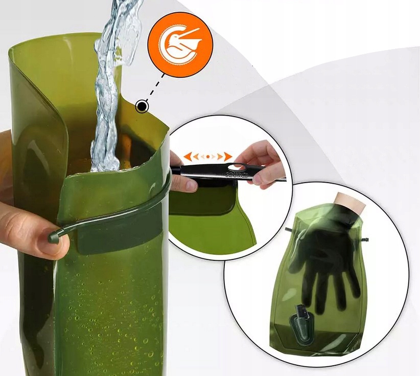 - Składany, po opróżnieniu składa się na płasko, po napełnieniu stoi pionowo.