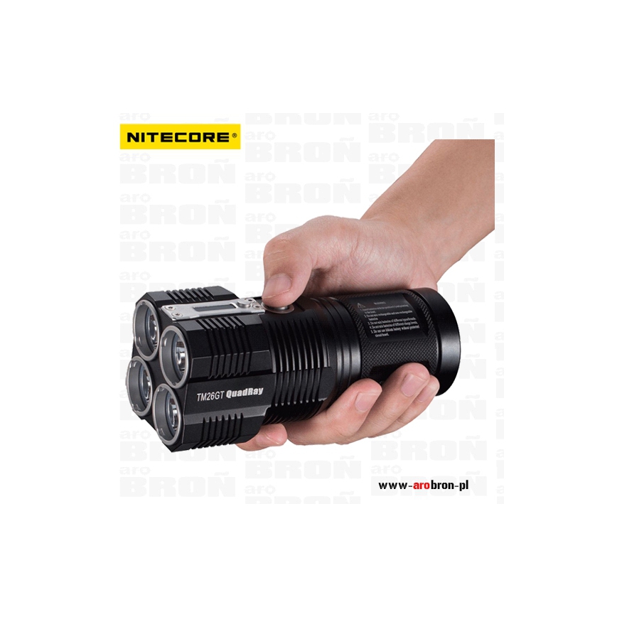 Latarka NITECORE TM26 Tiny Monster - to najmocniejsza, a zarazem kompaktowa latarka o mocy aż 3500 lumenów. Latarka posiada 4 diody CREE XP-L HI V3 LED, które siegają aż 704 metrów i dorównują swoją mocą reflektory samochodowe. Latarka świeci mocnym białym światłem. Soczewka została utwardzona oraz pokryta obustronną powłoką antyrefleksyjną. Wygodnym i funkcjonalnym elementem jest wyświetlacz OLED, na którym znajdziemy: moc światła, napięcie, poziom naładowania baterii, temperaturę, wybrany aktualny tryb oraz przewidywany czas pracy latarki. Latarka zasilana jest 4 akumulatorami 18650, które możemy naładować bezpośrednio w latarce. Zamiennie możemy zastosować 4 akumulatory 16340 (nie mogą być ładowane w latarce) lub 8 baterii CR123.