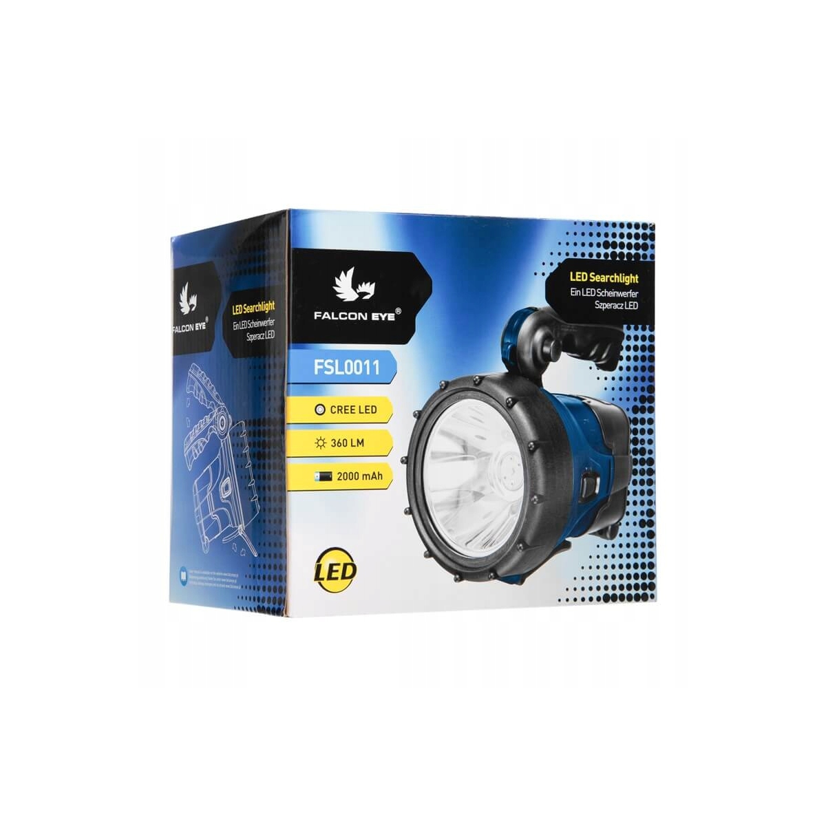 Falcon Eye LED FSL0011 to szperacz diodowy, który posiada regulowaną podstawkę, która ułatwi nam ustawienie reflektora na płaskiej powierzchni oraz składaną rączkę umożliwiającą chwyt pistoletowy. Wbudowany akumulator Li-ion 2000mAh wystarcza na 6 godzin ciągłej pracy.