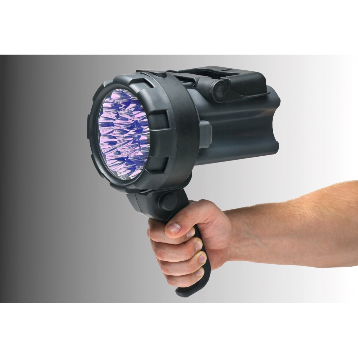 Mactronic 9018 LED UV to wodoodporny szperacz diodowy, który posiada regulowaną podstawkę, która ułatwi nam ustawienie reflektora na płaskiej powierzchni oraz składaną rączkę umożliwiającą chwyt pistoletowy. Latarka posiada 18 wbudowanych diod Super Bright LED o mocy 70 lumenów. Skuteczny zasięg szperacza wynosi 3 metry.