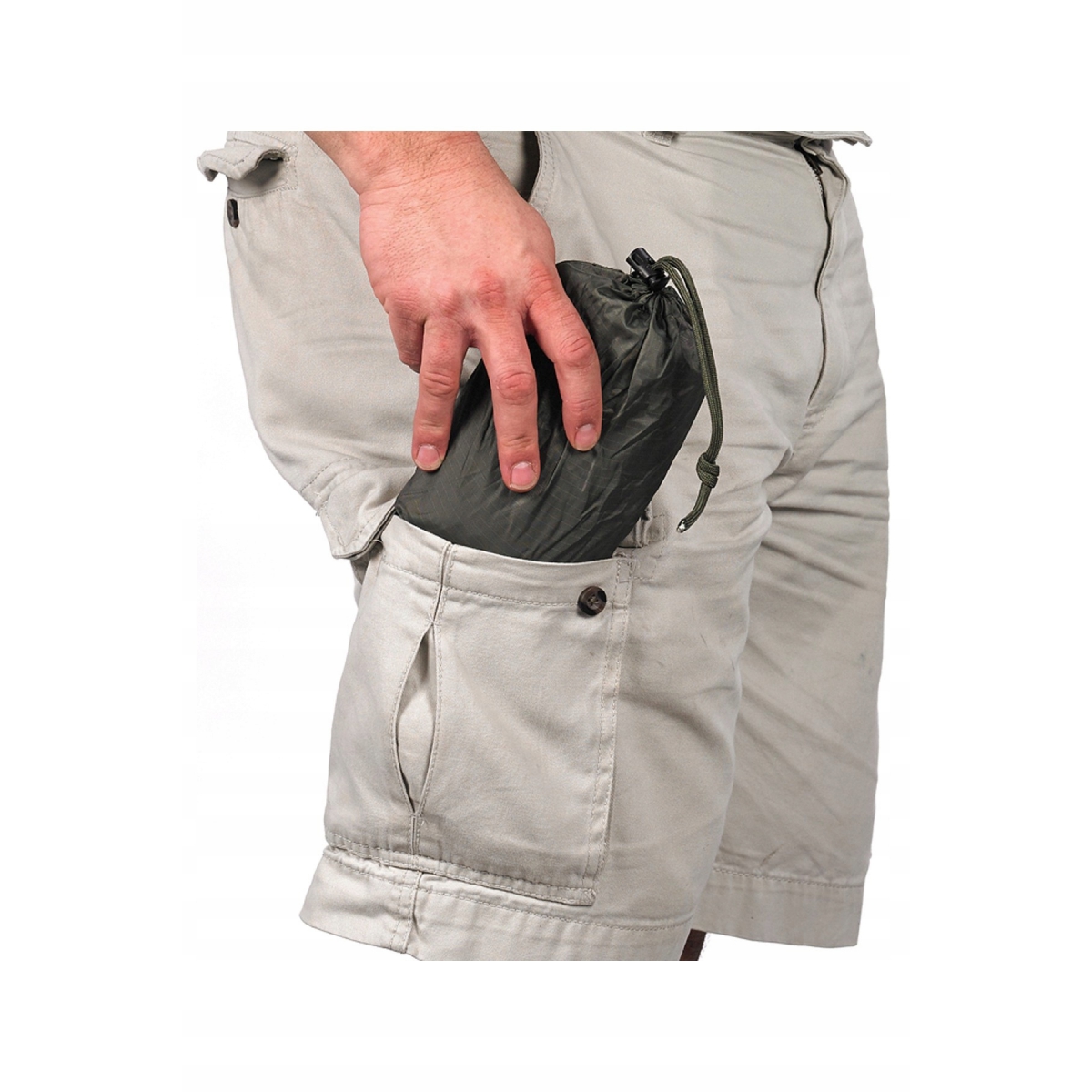 - Niewielkie wymiary po złożeniu, płachta mieści się w kieszeni spodni