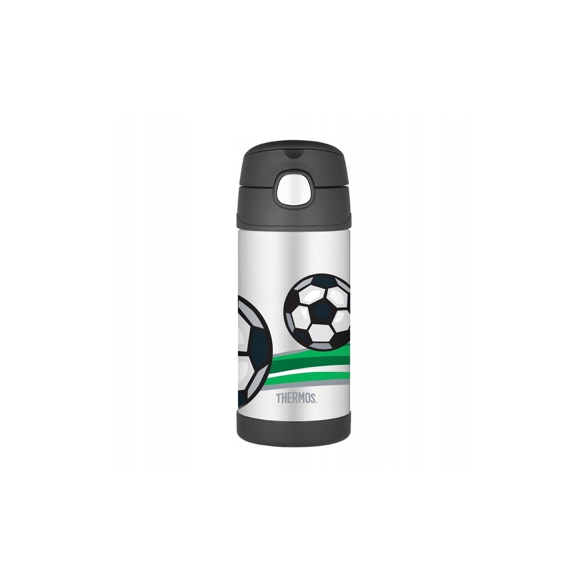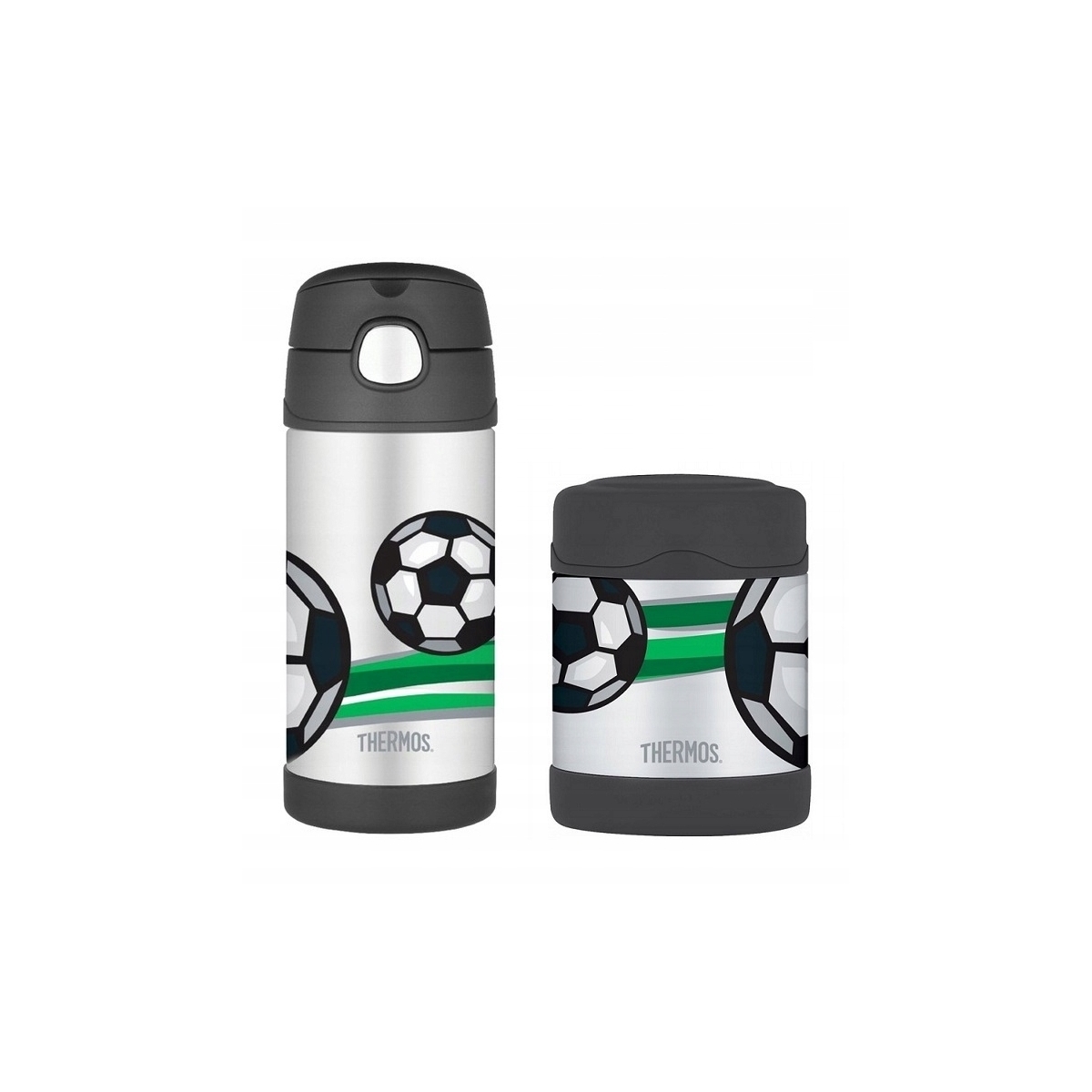 - Zestaw dwóch dziecięcych termosów marki Thermos na jedzenie oraz picie ( kubek ze słomką ) z motywem piłki nożnej.