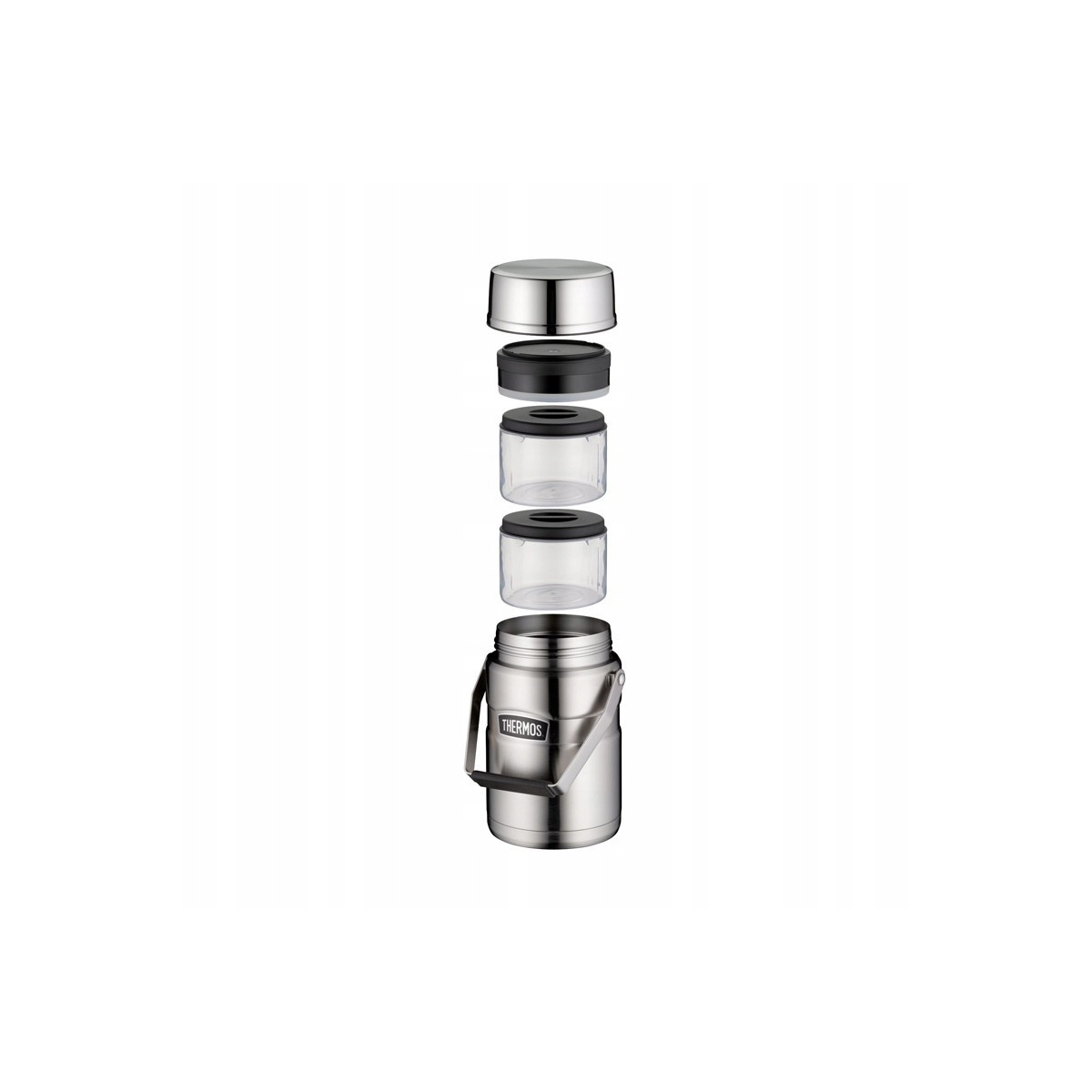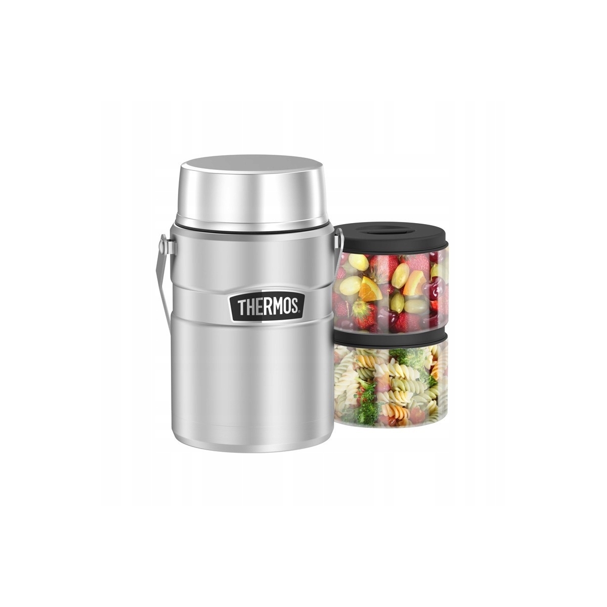 THERMOS 173070 - to izolowany próżniowo pojemnik ze stali nierdzewnej wyposażony w dwa naczynia. Przeznaczony do przechowywania żywności w wymaganej temperaturze, zarówno do zimnych, jak i gorących potraw. Składa się z dwóch wodoszczelnych naczyń o pojemności 0,6 l, które bezpiecznie można używać w kuchenkach mikrofalowych jak i w zmywarkach. Pojemnik może być używany również bez naczyń, jako wodoszczelny termos na jedzenie o objętości 1,39 l. Dodatkowo wyposażony został w kubek (nakrętkę) o pojemności 0,5 l oraz praktyczny uchwyt, umożliwiający swobodne przenoszenie.