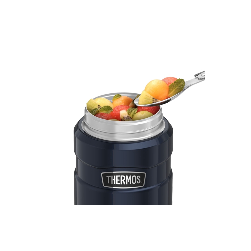 Termos obiadowy Thermos KING 470ml - został wyprodukowany przez wiodącego producenta Thermos, który jako pierwszy w 1904 roku użył technologii próżniowej w produktach komercyjnych. Zastosowany system próżniowy Thermax pozwala na utrzymanie ciepła posiłku do 9 godzin lub zimnego do 14 godzin. Pozwala to na zabranie ze sobą ciepłych dań obiadowych jak i zimnych typu lody czy sałatki.