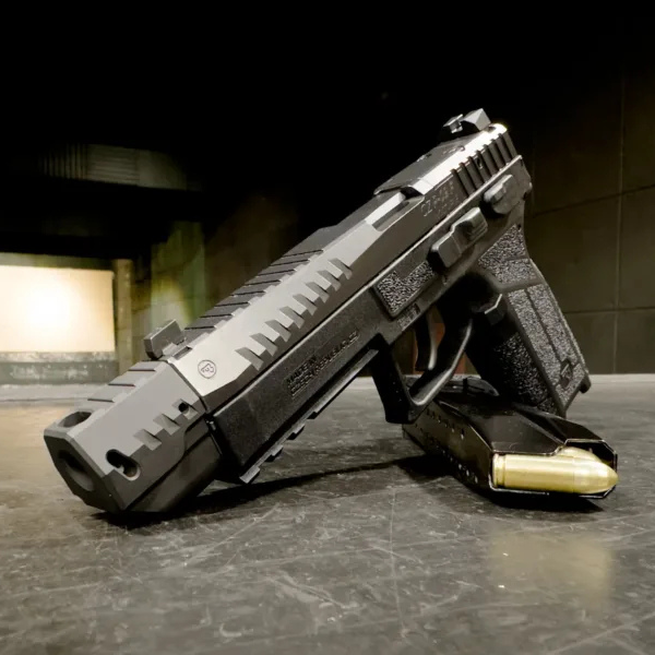 - Stylowy i spójny design – kompensator został zaprojektowany tak, by linie idealnie komponowały się z sylwetką zamka CZ P-09. Dzięki temu całość wygląda agresywnie i profesjonalnie, jak integralny element pistoletu.