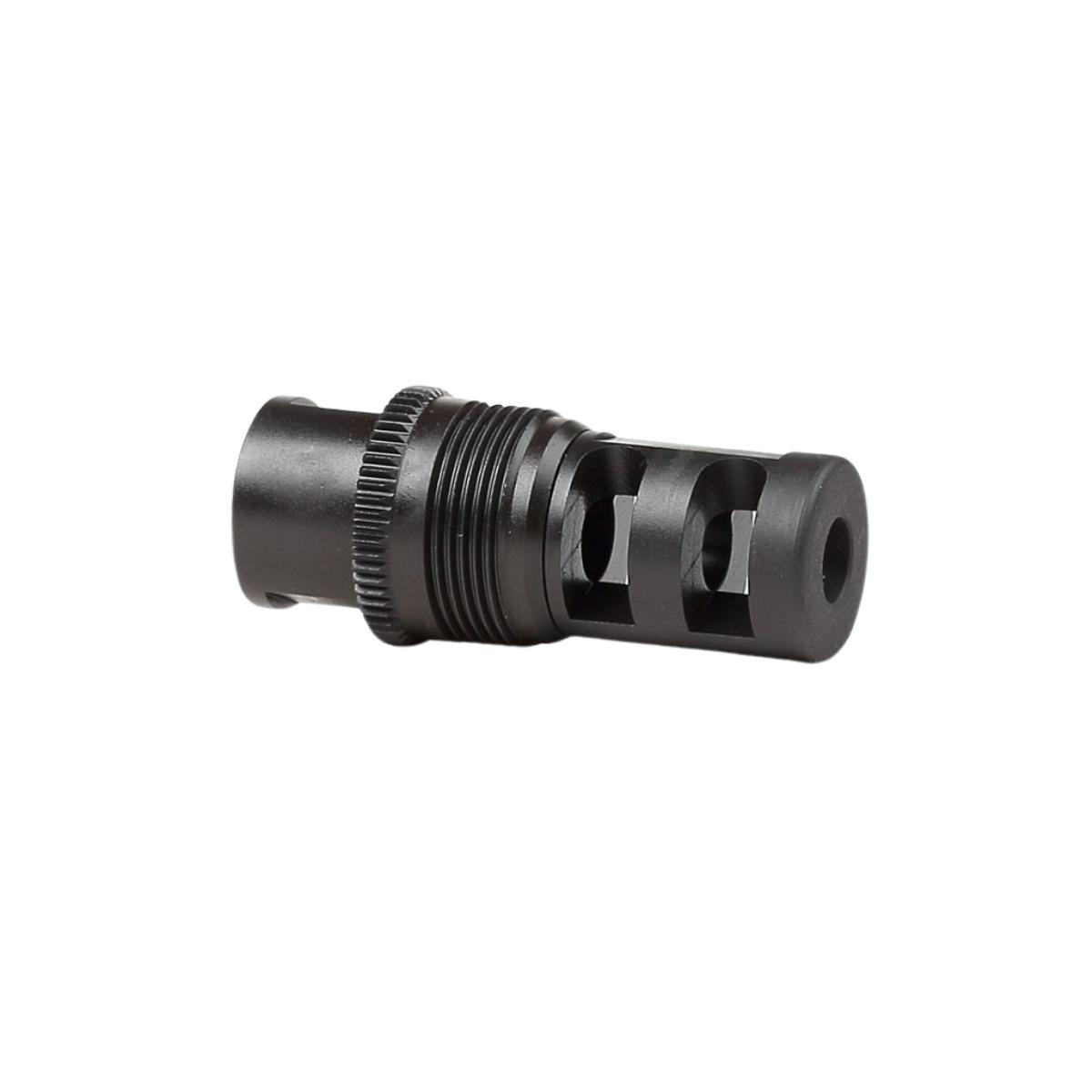 Dwukomorowa Konstrukcja: Duże porty boczne efektywnie odprowadzają gazy, minimalizując wpływ ciśnienia na strzelca, przy jednoczesnym zachowaniu kompaktowych wymiarów urządzenia.